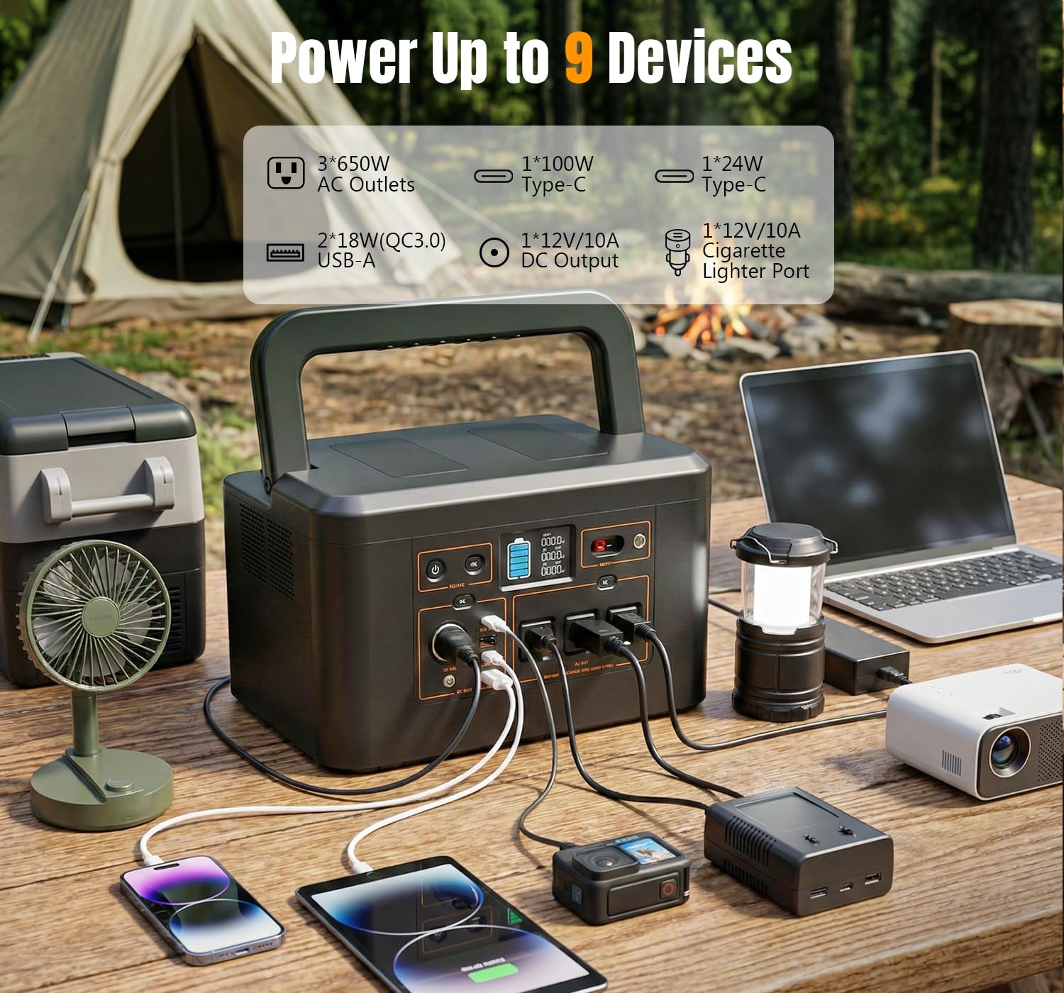 【Power All Loads for the Road】 576Wh generator has everything you need in one unit, with 650W AC outlets*3, 1*USB-C100W, 1*USB-C 24W, 2*USB-A, 1*DC 5521, 1*car port to power all essentials you need.