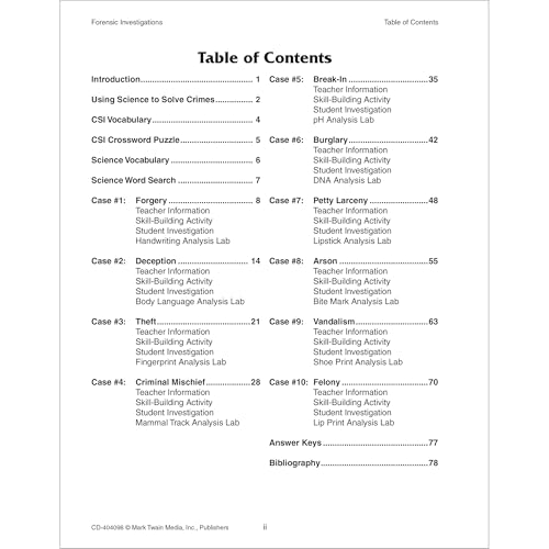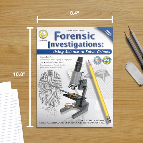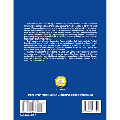 Forensic critical thinking for kids ages 11+ Connect students to science in an engaging way using the Mark Twain Forensic Investigations Workbook. Science Middle School Books are a great way for kids in middle school and beyond to build critical thinking and science skills through focused lessons and practice surrounding science to solve high crimes. Why You’ll Love This Science Book Engaging and educational cases, labs, and activities. DNA and fingerprints, body language, and handwriting some of the topics included in this middle school science workbook to help inspire learning in your child’s classroom or homeschool curriculum. Tracking progress along the way. Analysis labs are included to assess student knowledge after studying each case. Use the answer key to check for accuracy. Practically sized for every activity. The 80-page workbook is sized at about 8 ¼” x 10 ¾”―giving your child plenty of space to complete each exercise. About Mark Twain Books Designed by leading educators, Mark Twain Publishing Company specializes in providing captivating, supplemental books and resources in a wide range of subjects for middle- and upper-grade homeschool and classroom curriculum success. The Mark Twain Science Workbook Contains: 10 high crime cases and activities Analysis labs Bibliography and answer key