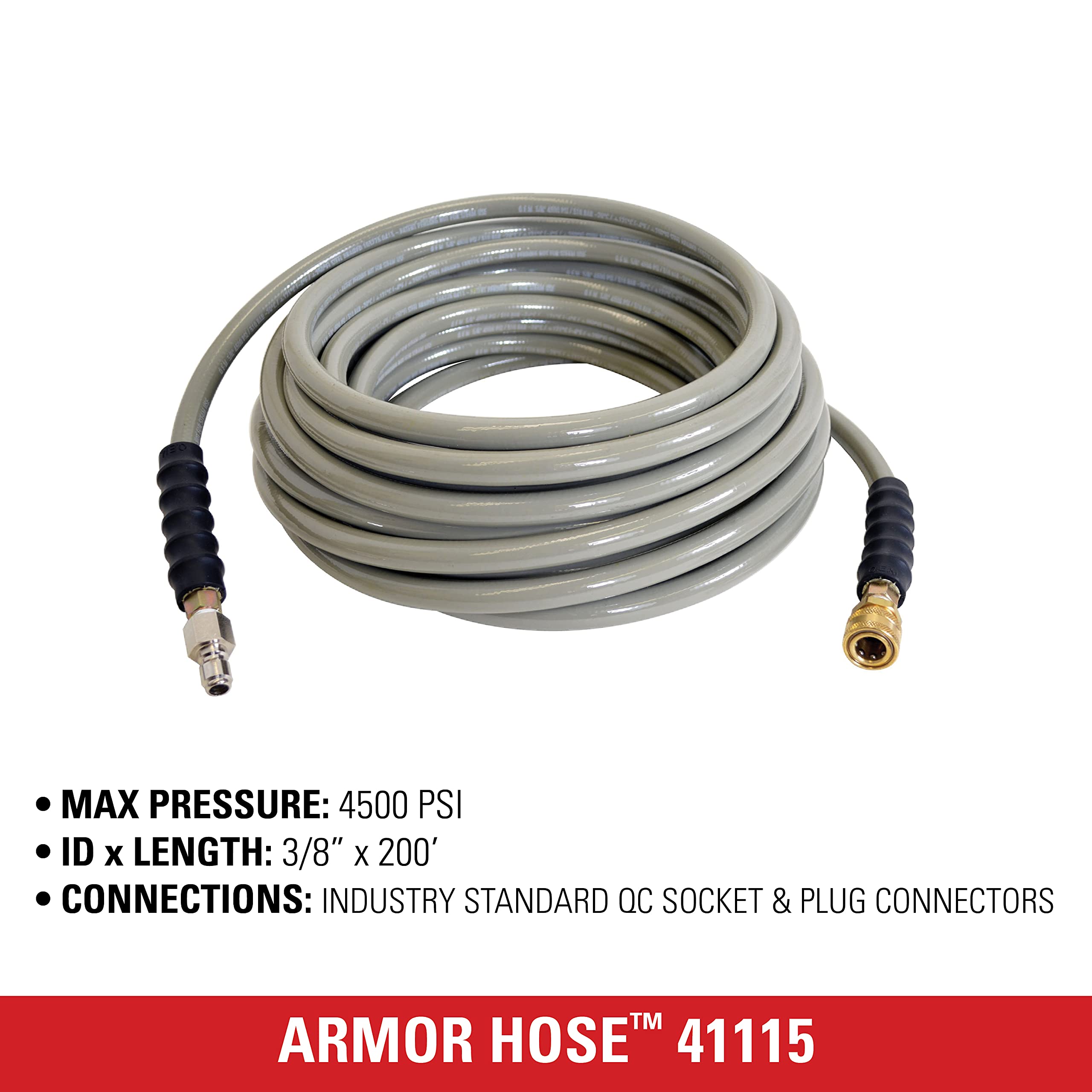 Easy Connections: 3/8" Male quick connect plug x 3/8" Female quick connect socket by 200’ rated up to 4500 PSI replacement/extension hose