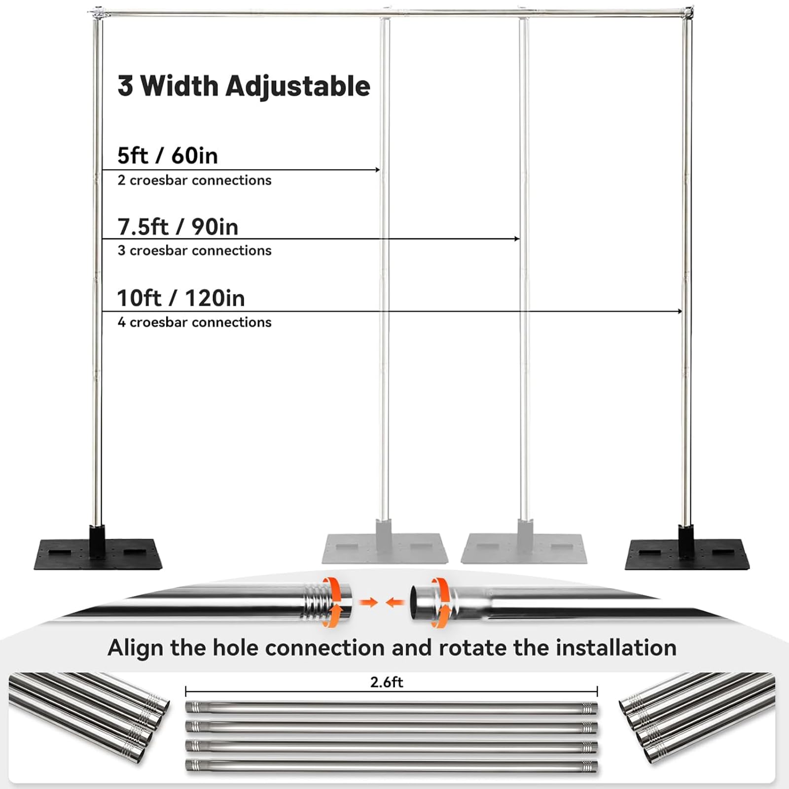 Adjustable Height & Width: Both the height and width of the pipe and drape stand are adjustable to meet your needs, with options available in 5ft, 7.5ft, and 10ft, providing versatility for different setups.