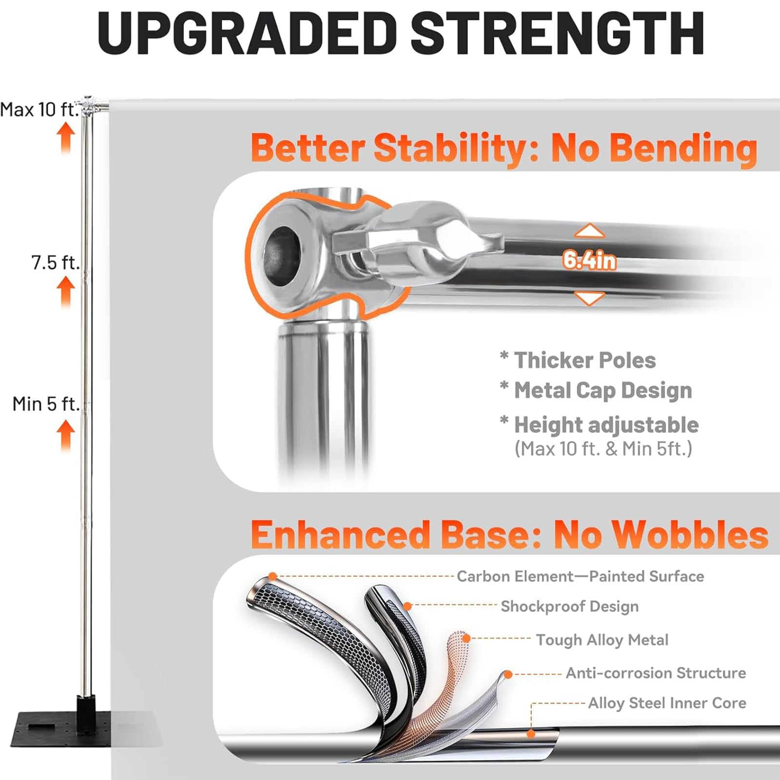 Sturdy & Stable: Our back drop adjustable stand is made with thickened stainless steel tubes and a robust iron base, built to last and designed for enhanced stability. Besides, this back drop stand won't wobble or bend under heavy loads.