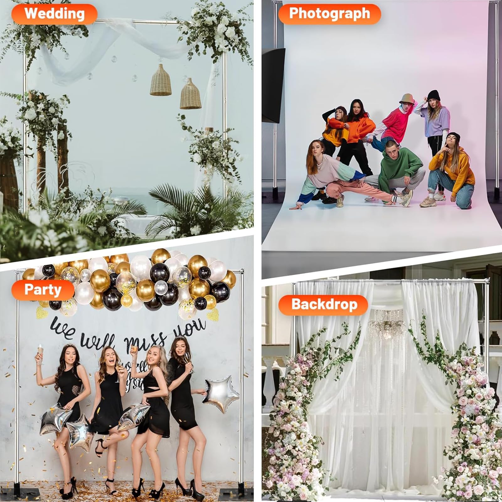 Wide Applications: The backdrop stands are great for hanging curtains, balloons, string lights, flowers, and more. Perfect for weddings, holiday parties, photography backdrops, photo booths, banner stand bsackgrounds and so on.