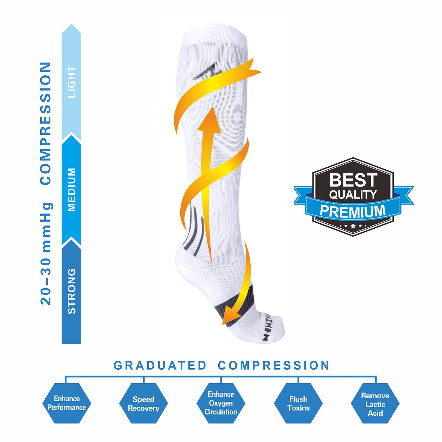 【GRAB CONTROL OF YOUR WELLBEING IN STYLE】An excellent compression hose very durable with a fashionable look and variety colors available Washable designed with Quality Lycra Fabric built for durability Customers agree the comfort is amazing Use them on a plane during that 9 hr flights or during that 6 mile walk Your durable 20-30 mmHg socks work with your routine Feel the shock absorption effect instantly that really helps reduce fatigue and swelling in your lower leg