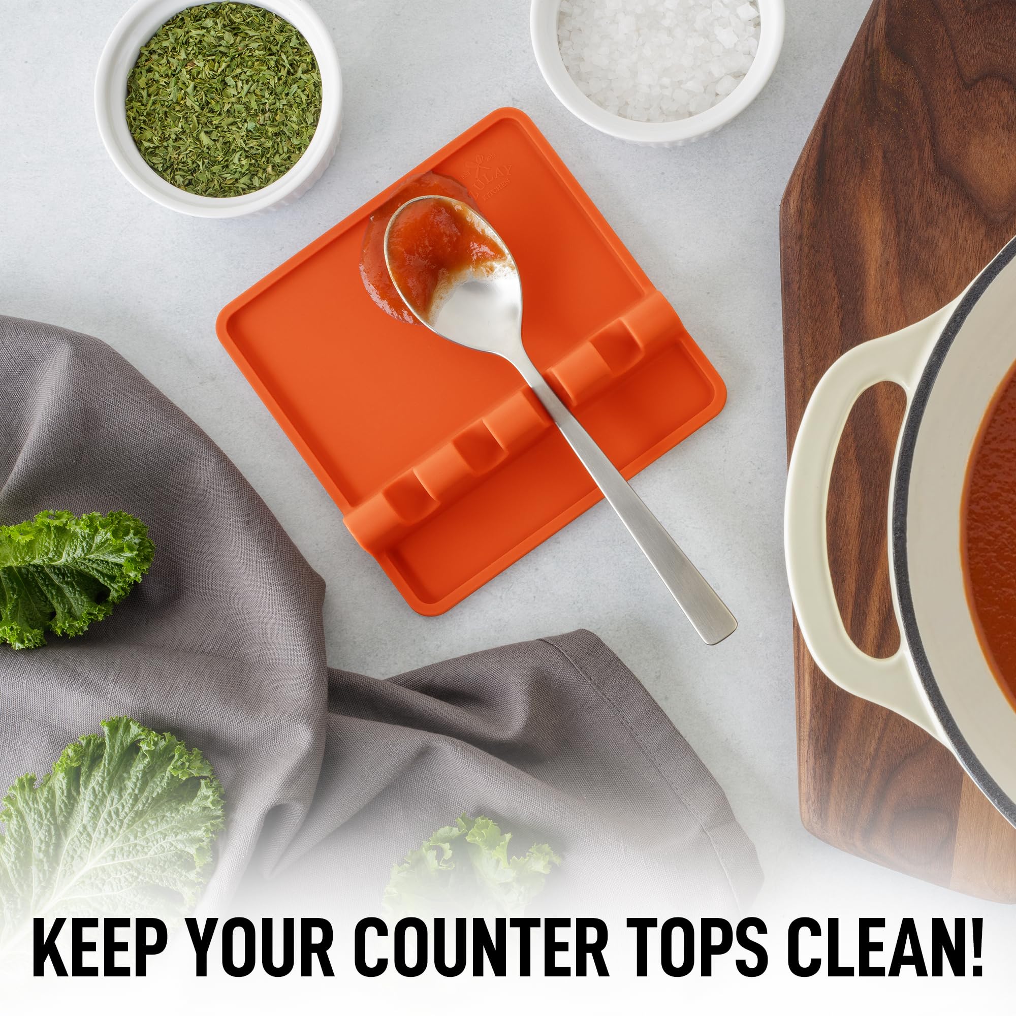 KEEP YOUR COUNTERTOPS CLEAN: Are you tired of random oil and sauce drips all over stovetops and kitchen counters while cooking? Say no more! Our spoon rest has raised edges to catch all the drips, making it a great addition to your kitchen gadgets for keeping counters and stoves splatter-free. Revolutionize your cooking, baking, or grilling experience with this beautifully designed square spoon holder.