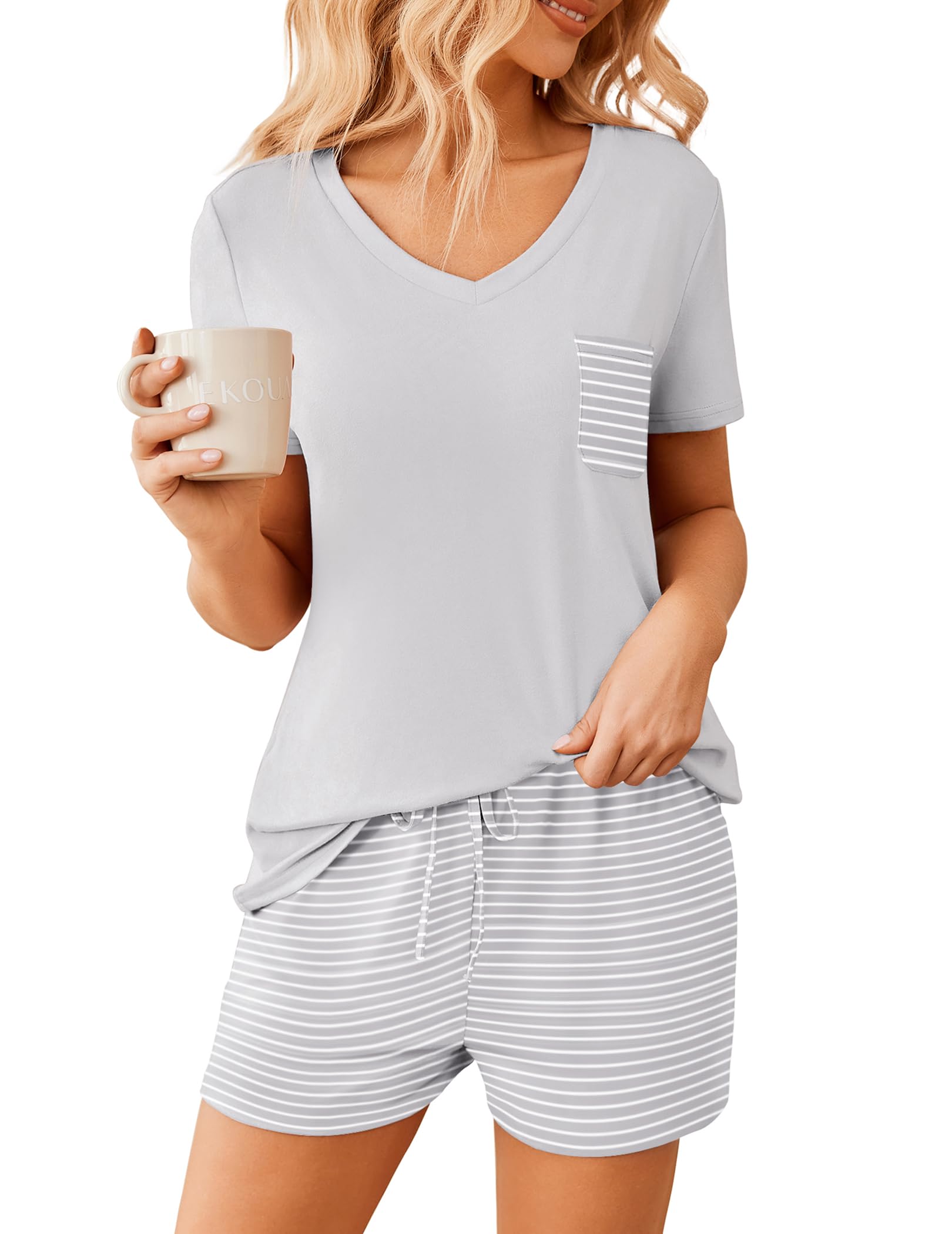 This soft pajama top features V neck, short sleeve, pleated front neckline,and the comfy modal pajama shorts is designed with elastic waist, drawstring and thigh-length