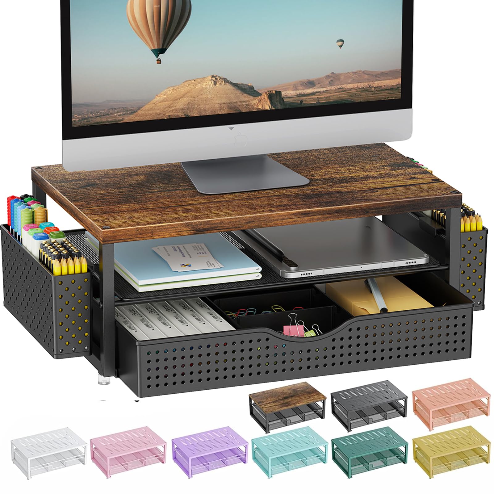 【Organized Storage】This desk monitor stand/organizer features two tiers of storage for files and notes. Equipped with two pen holders and a drawer , it effortlessly organizes pens, scissors, and other desk essentials, keeping everything within reach.