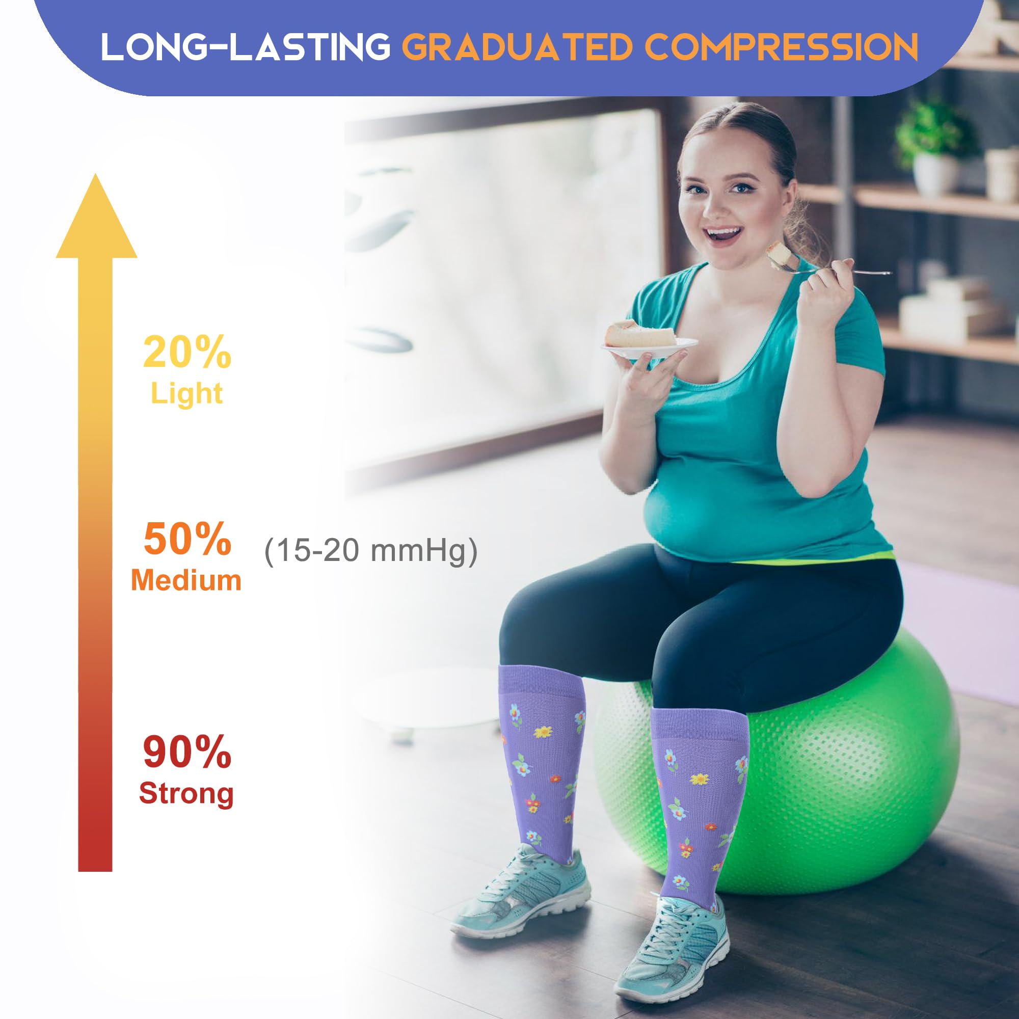 Compression Socks for Women Plus Size: High-quality plus size compression socks are offer a compression grade of 15-20 mmHg. These socks effectively alleviate a range of blood circulation issues, including edema, lymphedema, neuropathy, blood clots, surgery, hypertension, swelling, muscle and leg pain, cramps, fatigue, and varicose veins.