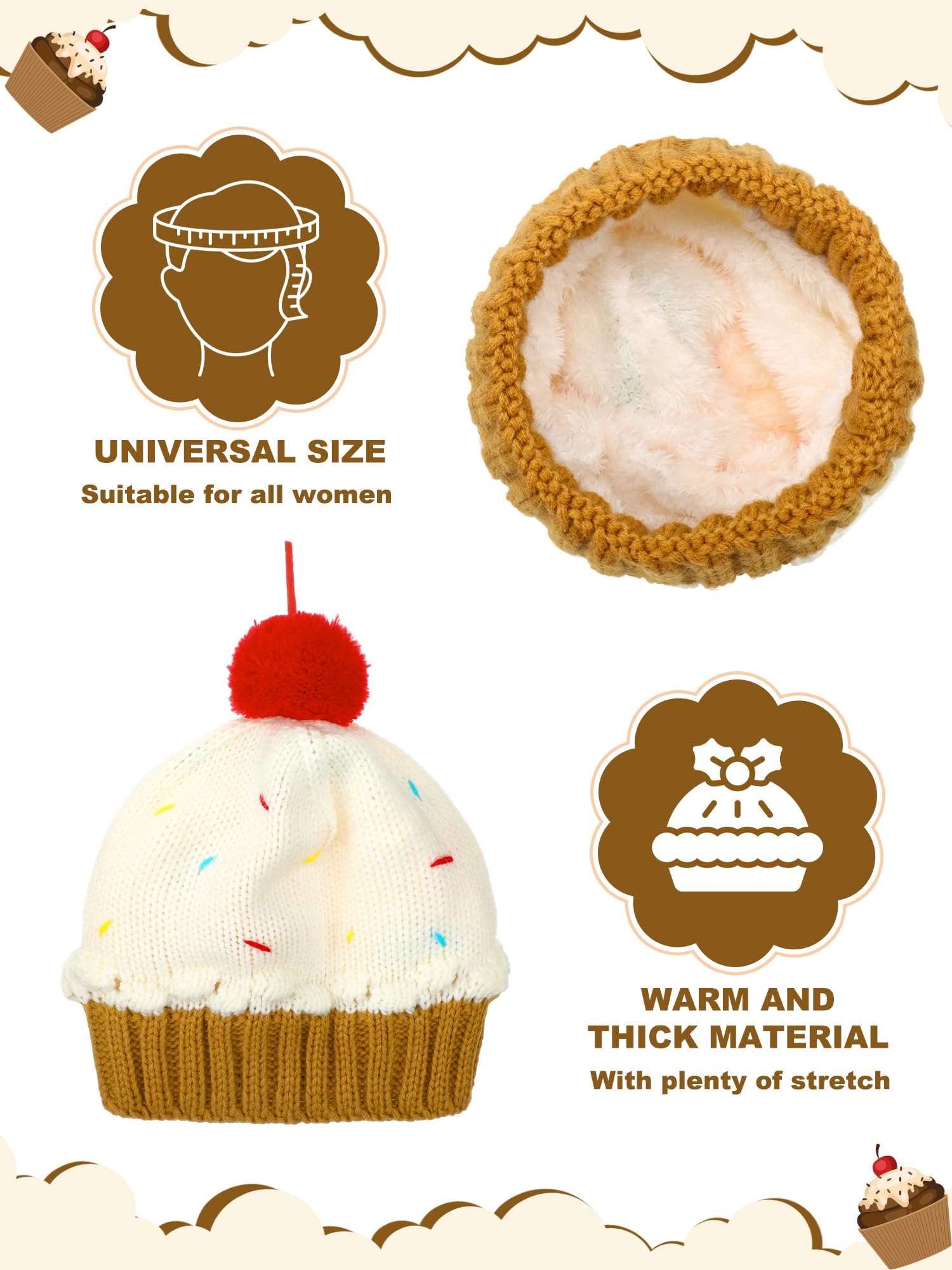 Practical and Versatile Size: ease of wear and versatility is what sets our Christmas cupcake beanie apart; Its size fits well for adults, making it a breeze to put on and take off, reducing the usual struggles of winter wear