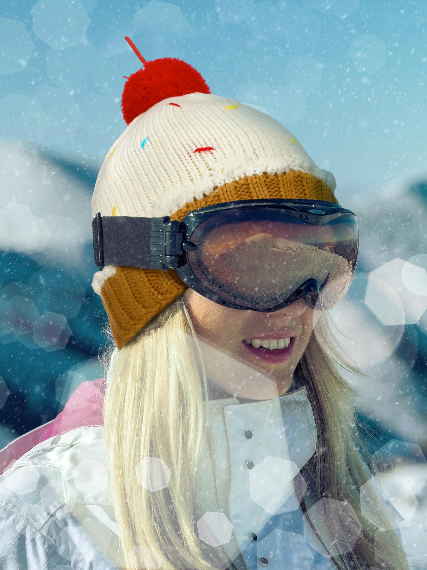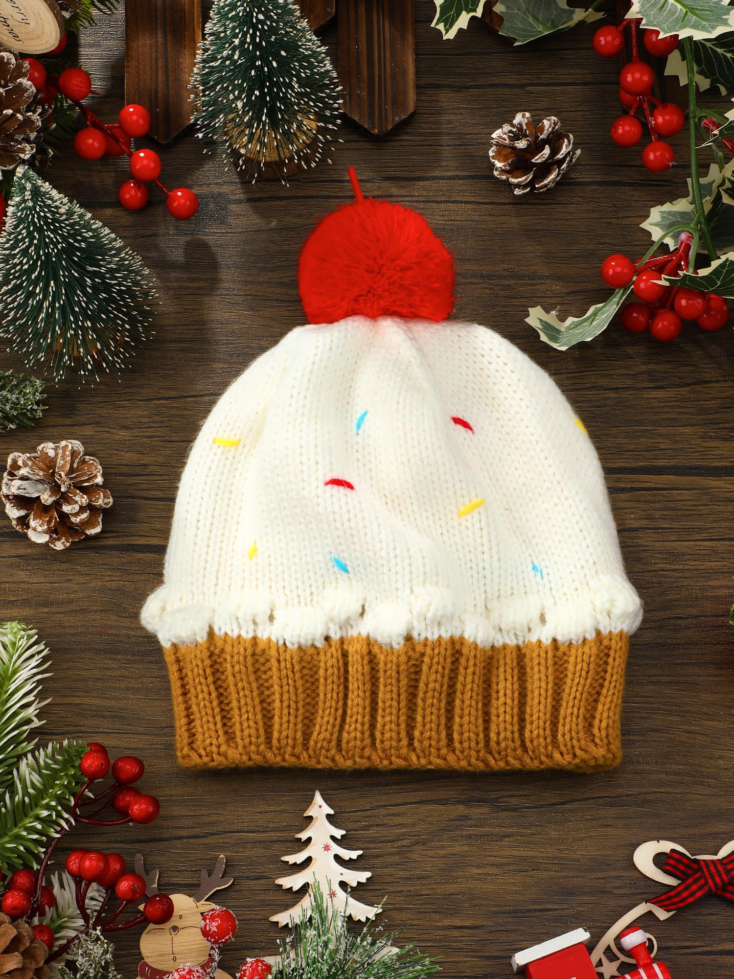 Ideal for Various Events: featuring a charming cupcake design with knitted lace, a cute pompom on the top, and colorful sugar grains, this Xmas cupcake beanie hat is a delightful hit for various situations; Be it skiing, hiking or parties