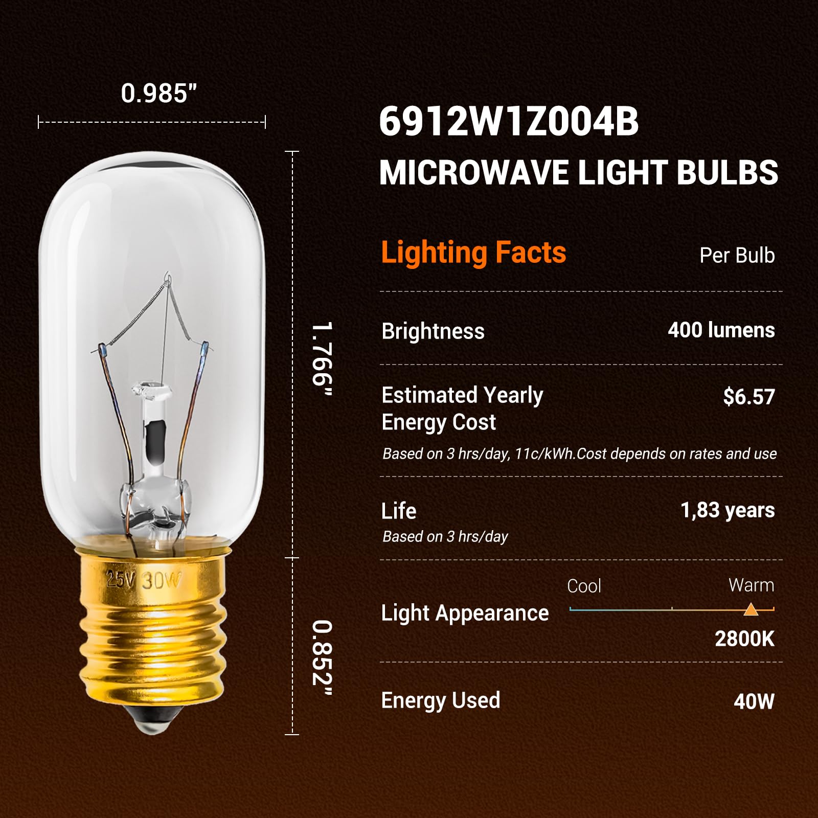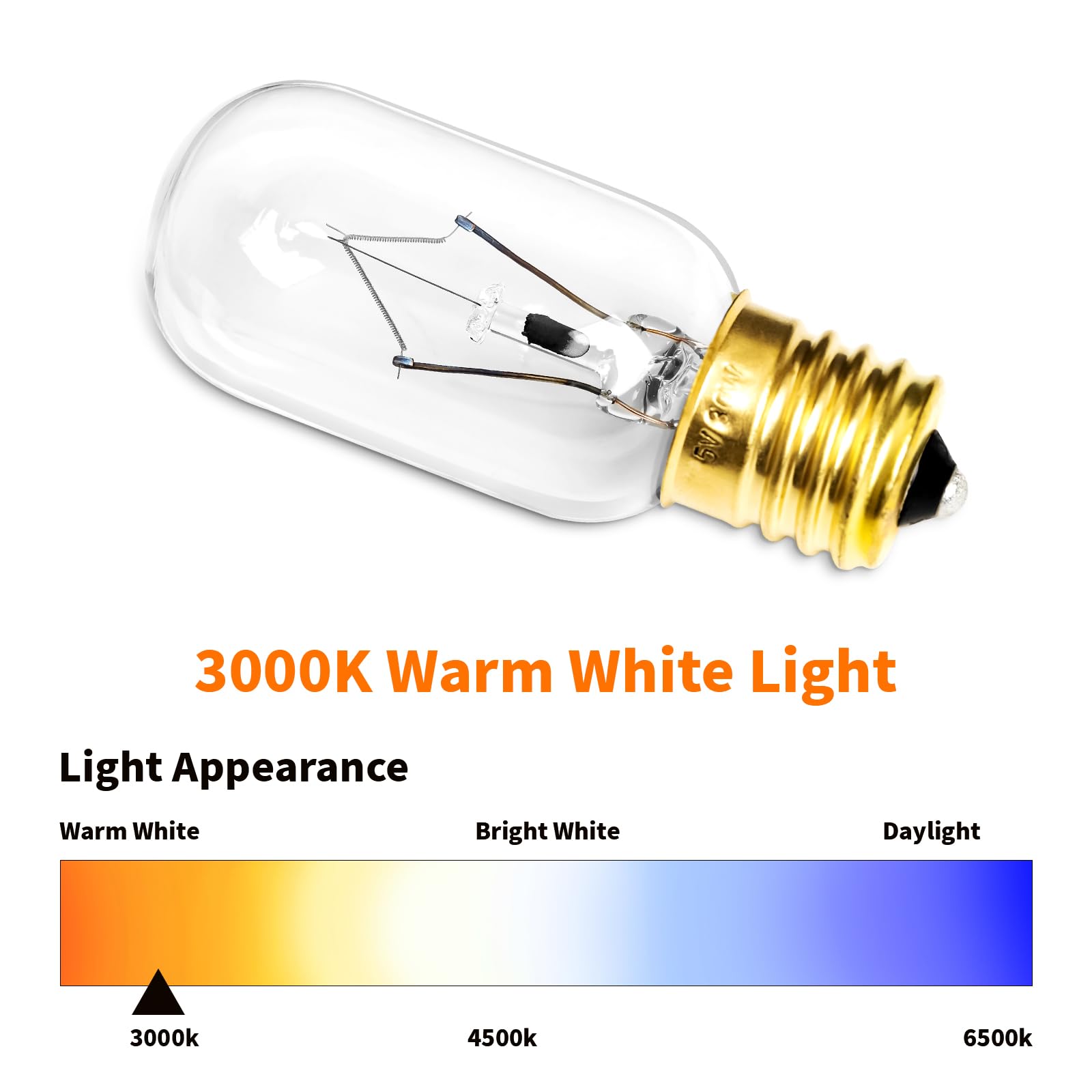 125V 30W E17 base, 2.6" in length, 1" in width, warm white.