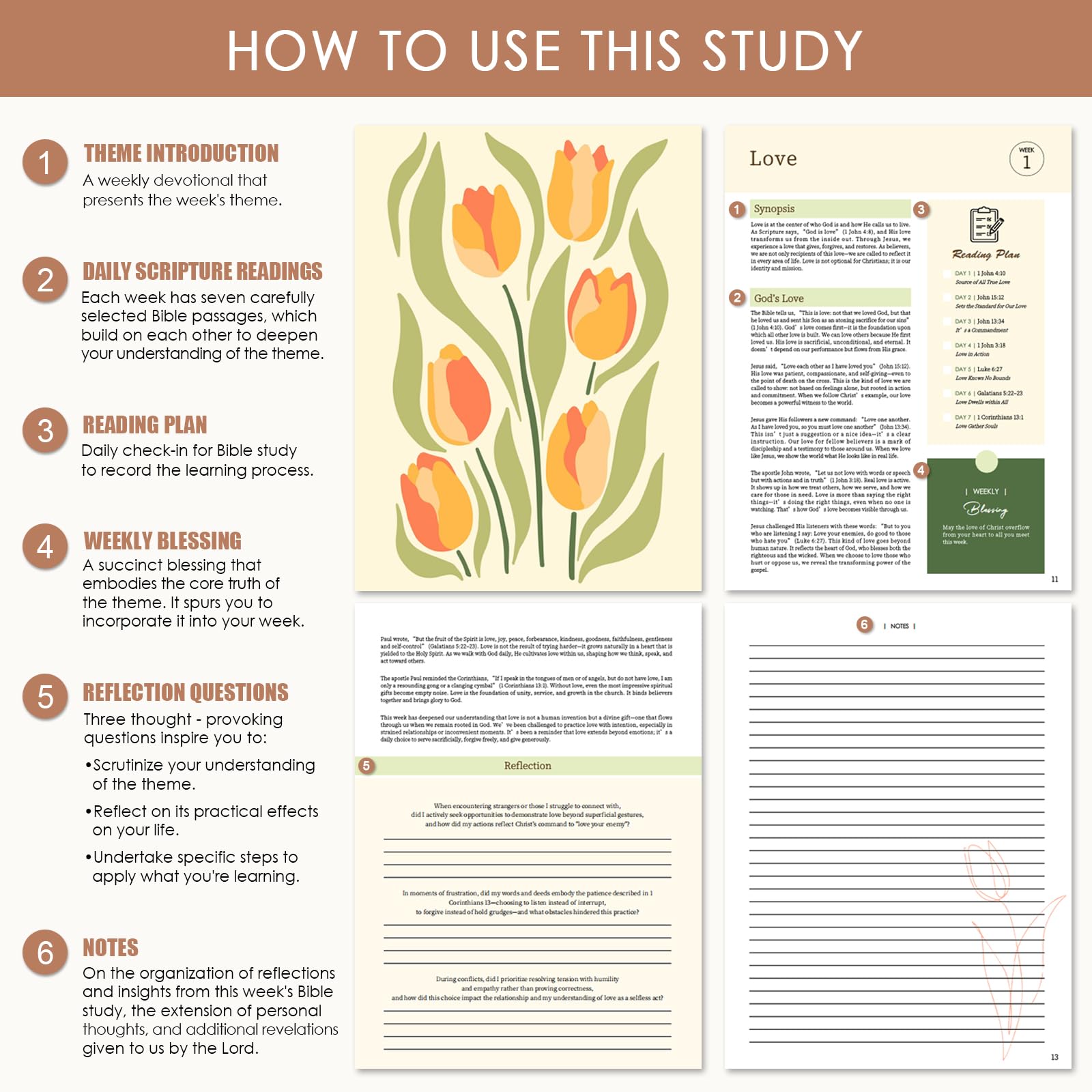 52-Week Thematic Journey Through Scripture: Dive into a structured, year-long exploration of 52 core Christian themes—from foundational concepts like Love, Faith, and Hope to eternal perspectives such as Redemption, Salvation, and Eternal Hope. This study weaves together Old and New Testament passages thematically, helping you build a comprehensive biblical worldview that connects divine truth to everyday life.