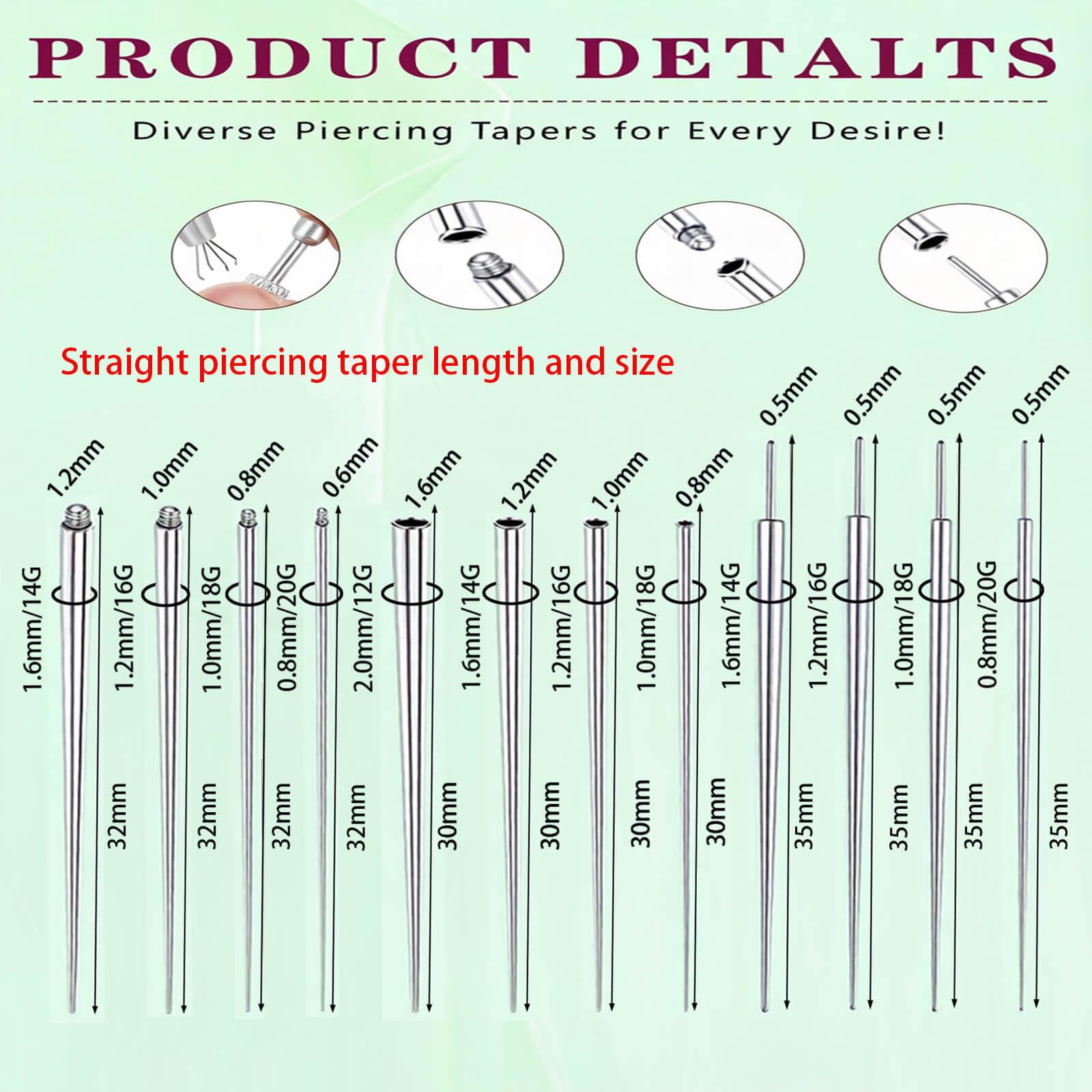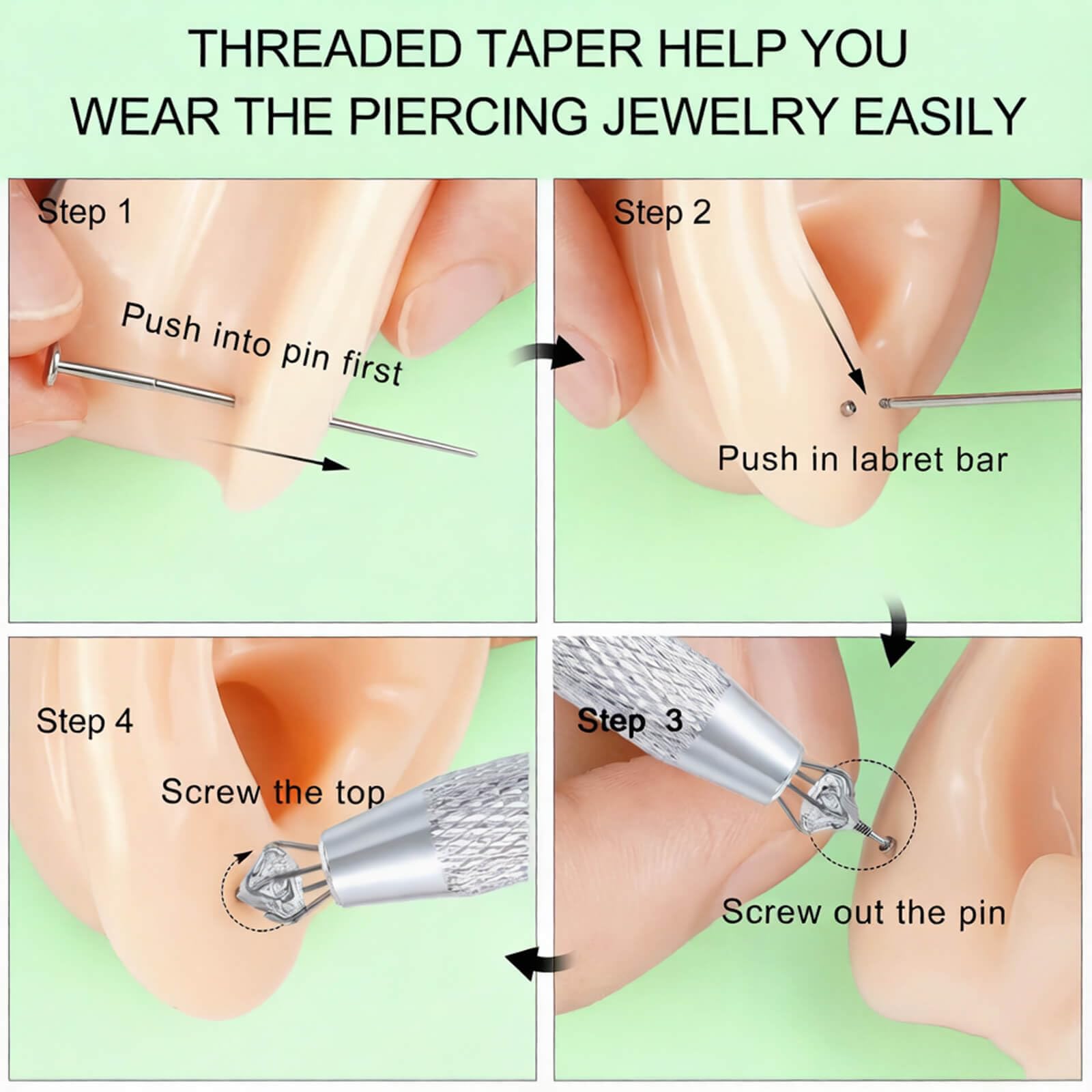 EASY 4‑STEP PROCESS FOR PAIN‑FREE CHANGES: ① Insert tapered pin → ② Guide threader through → ③ Remove pin while holding threader → ④ Attach new jewelry. Whether you are a beginner or an experienced piercer, our taper tools make it easy to insert or remove flat back earrings, stud, and nose studs.