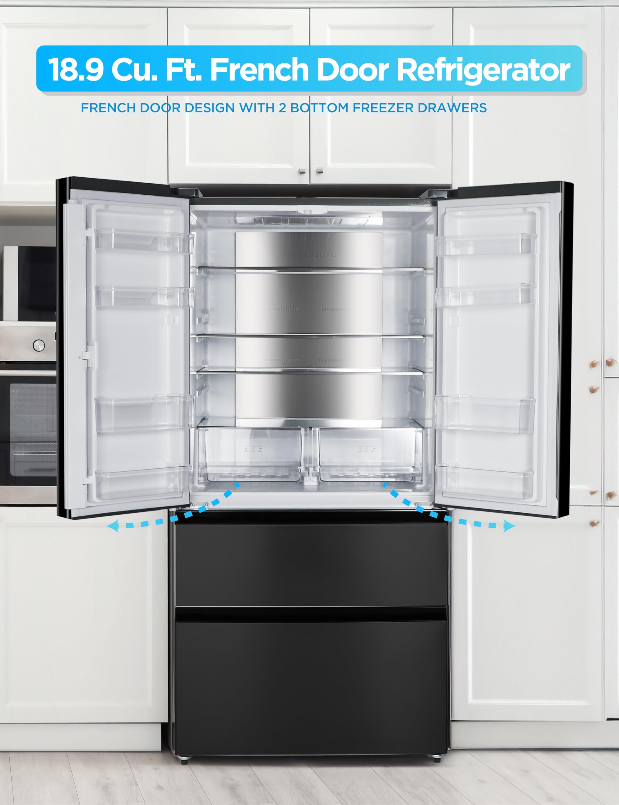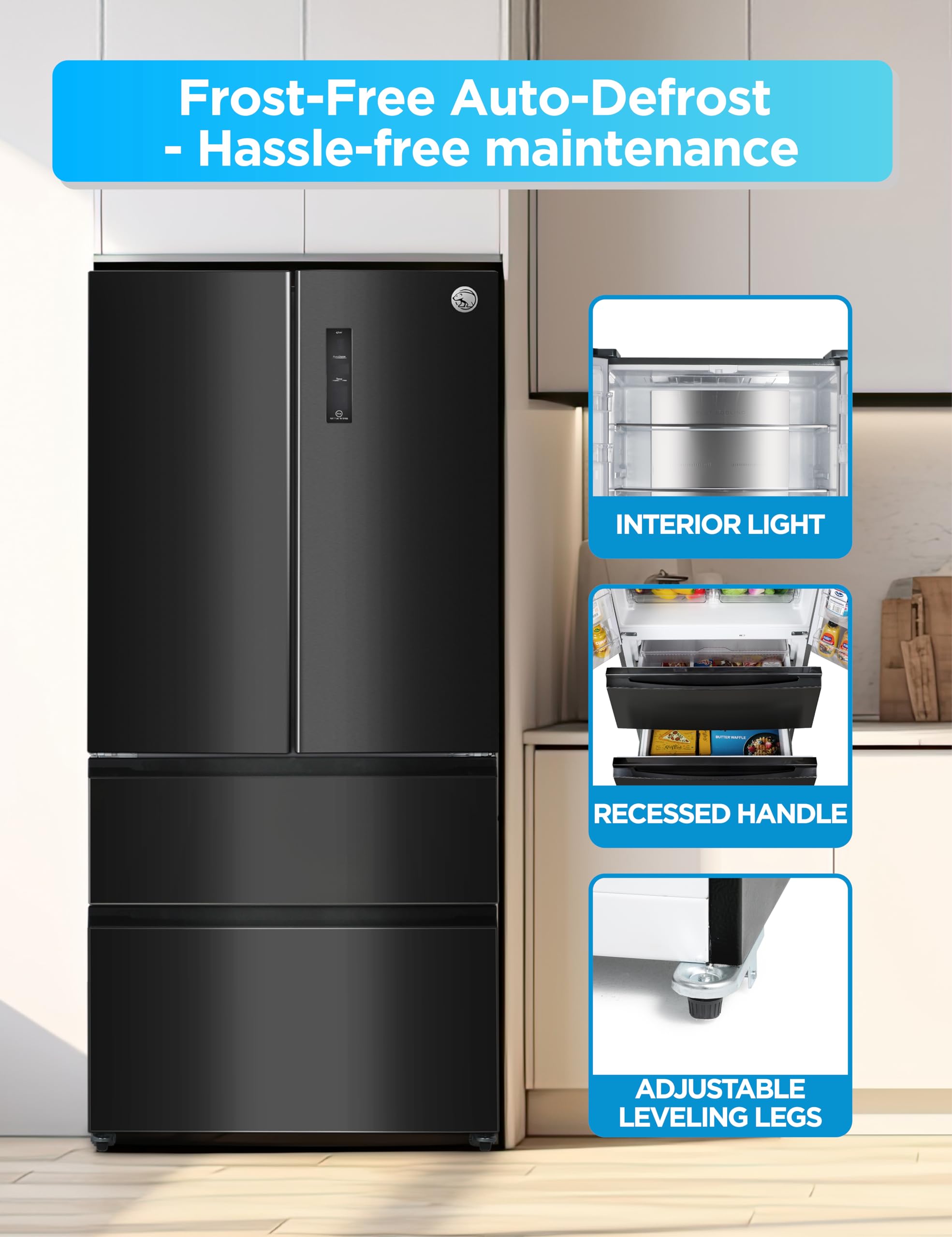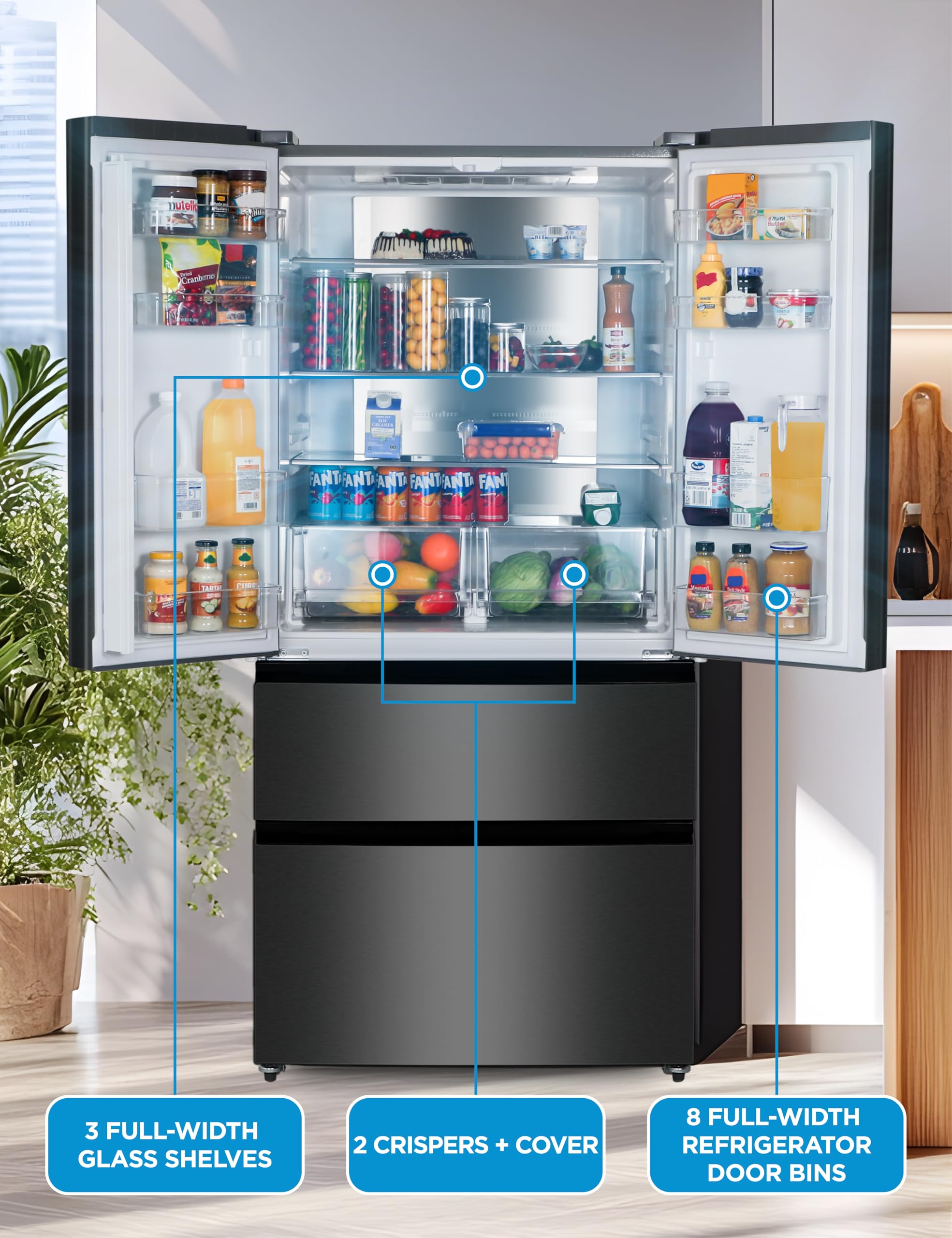 Spacious Organization: With full-width 12.35 cu. ft. fridge and 6.53 cu. ft. total freezer capacity, our French door fridge with freezer offers ample storage space and options for all your essentials