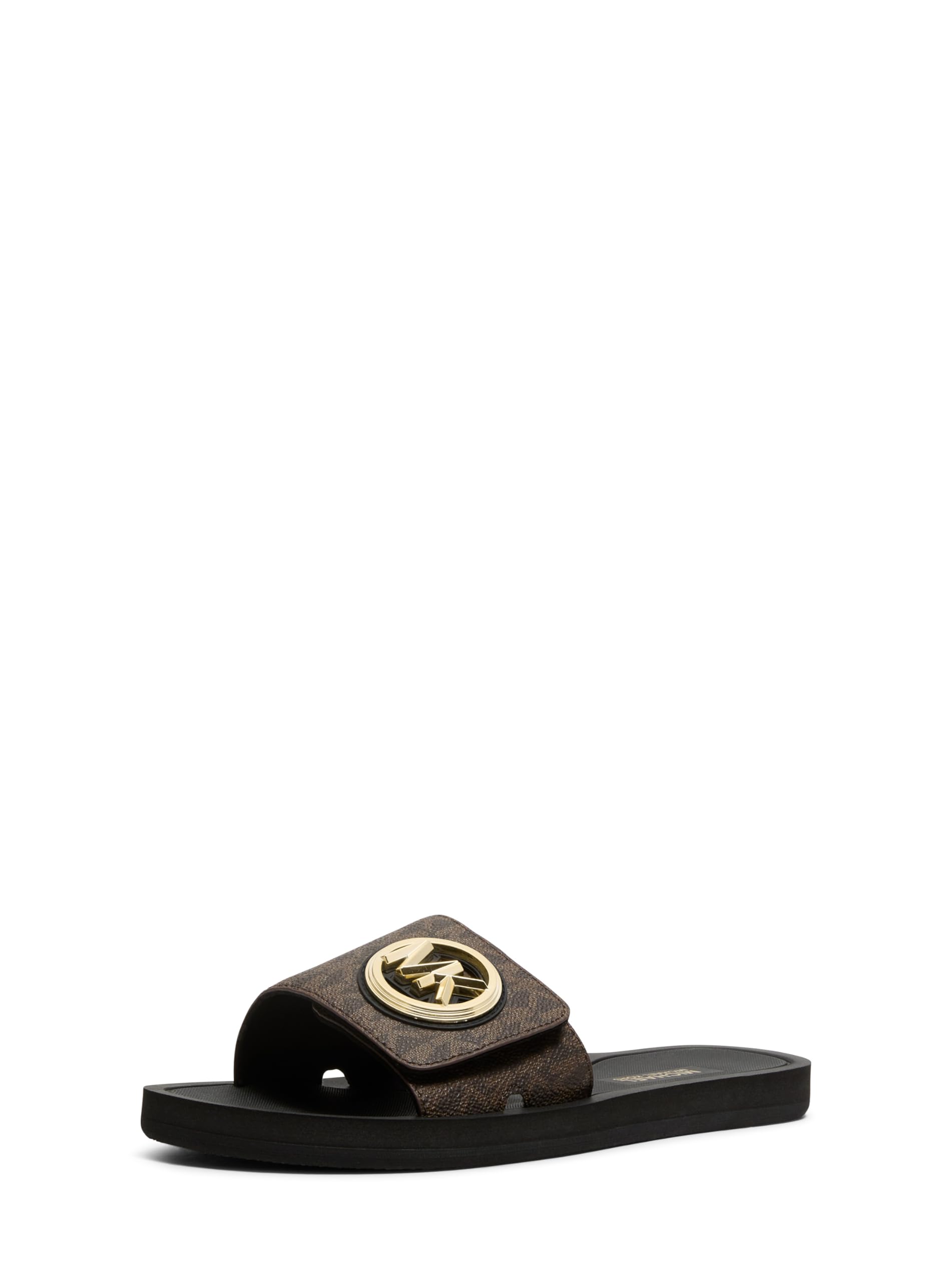 Description Pool slide sandal with MK circle stacked charm hardware on molded footbed.