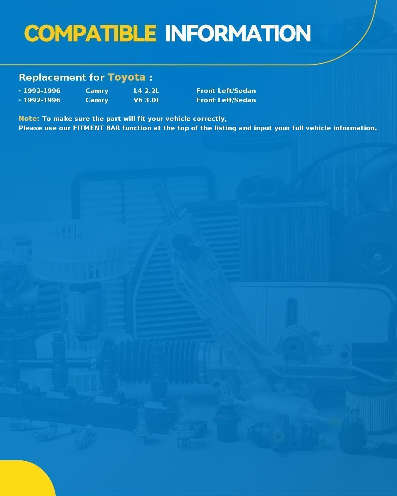 Vehicle Fitment:Window Regulator and Motor Assembly compatible with Toyota 1992-1996 Camry Sedan.Please MATCH your vehicle on the left top before purchasing