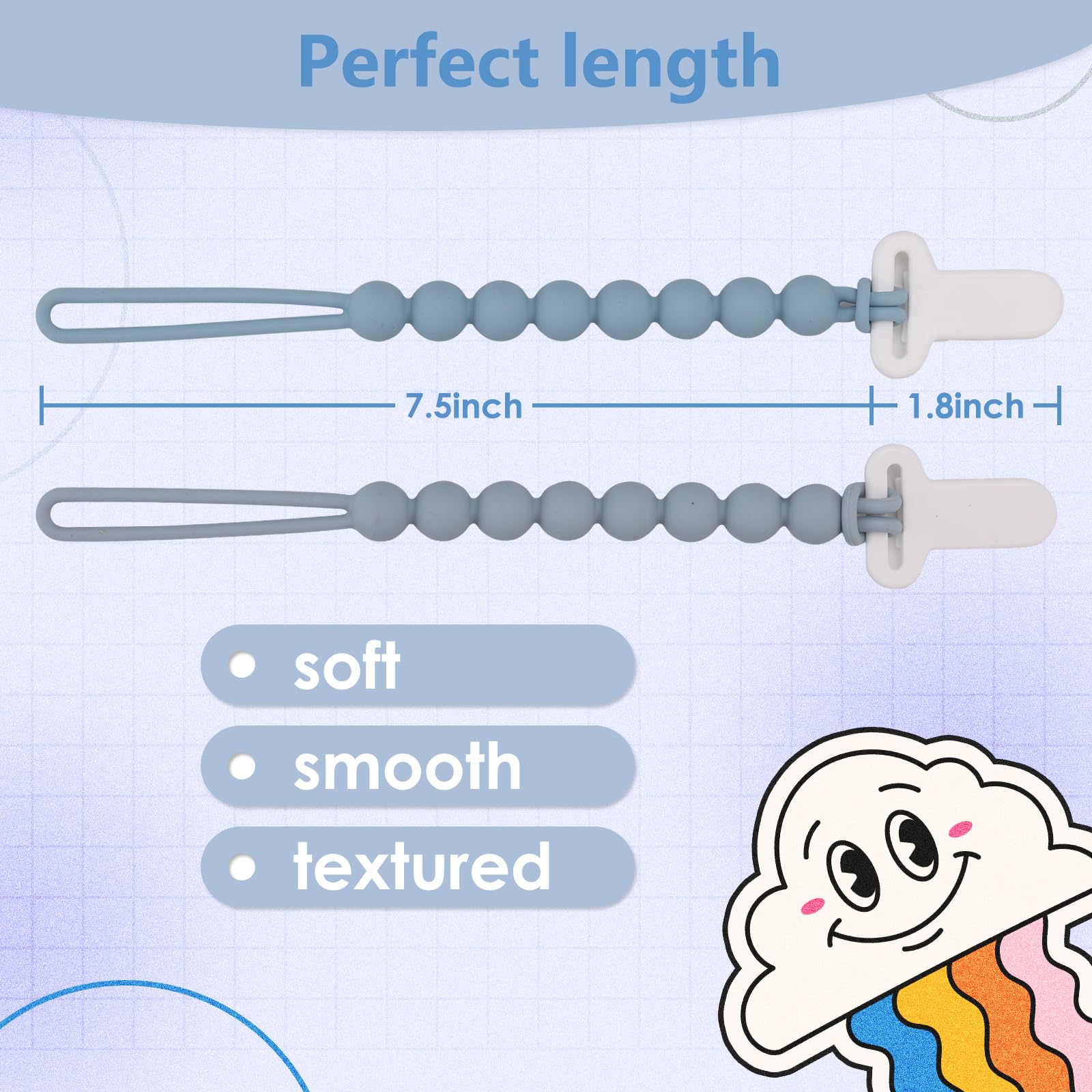 Soothe Your Baby's Soreness: Our silicone pacifier clip isn't just practical, it can also provide relief for your baby's sore or teething gums. The clip offers visual and tactile stimulation, making it an essential item for any parent of a newborn or young baby.