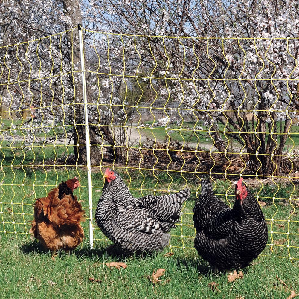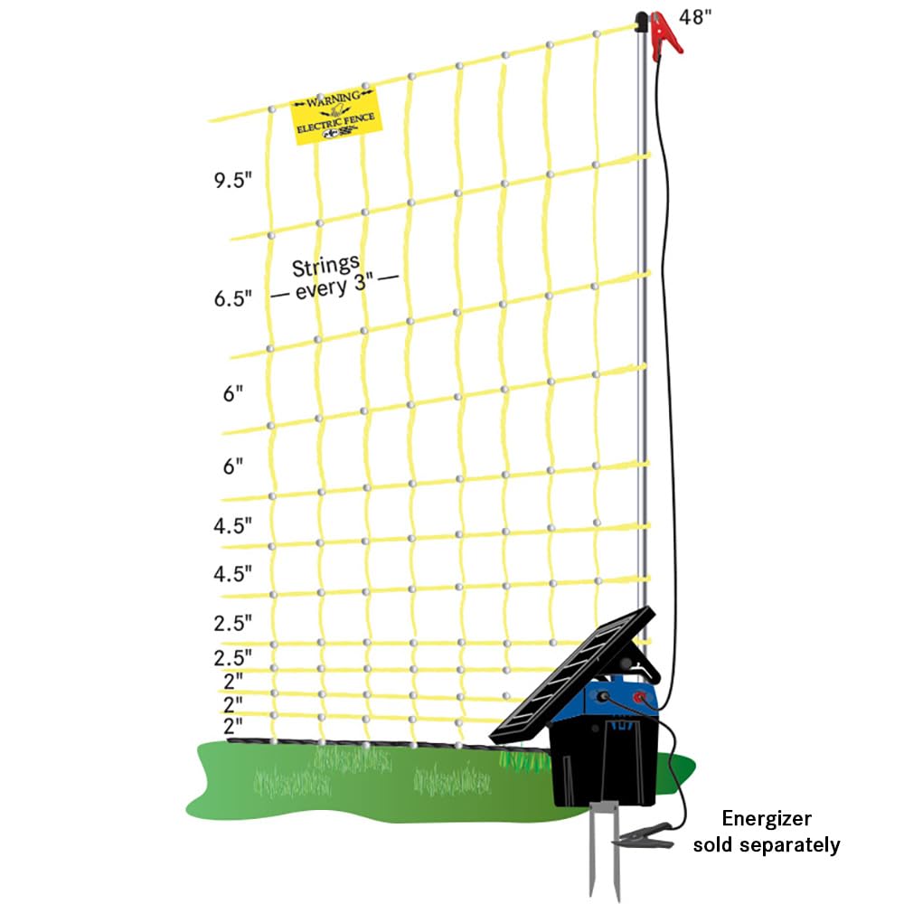 48" TALL — Securely contain chickens, ducks, geese and small livestock. Deters coyotes, foxes, bears, raccoons, stray dogs and other non-flying predators. 2" x 3" mesh openings at bottom of fence will contain chicks 6 weeks and older. Works for sheep and goats too!