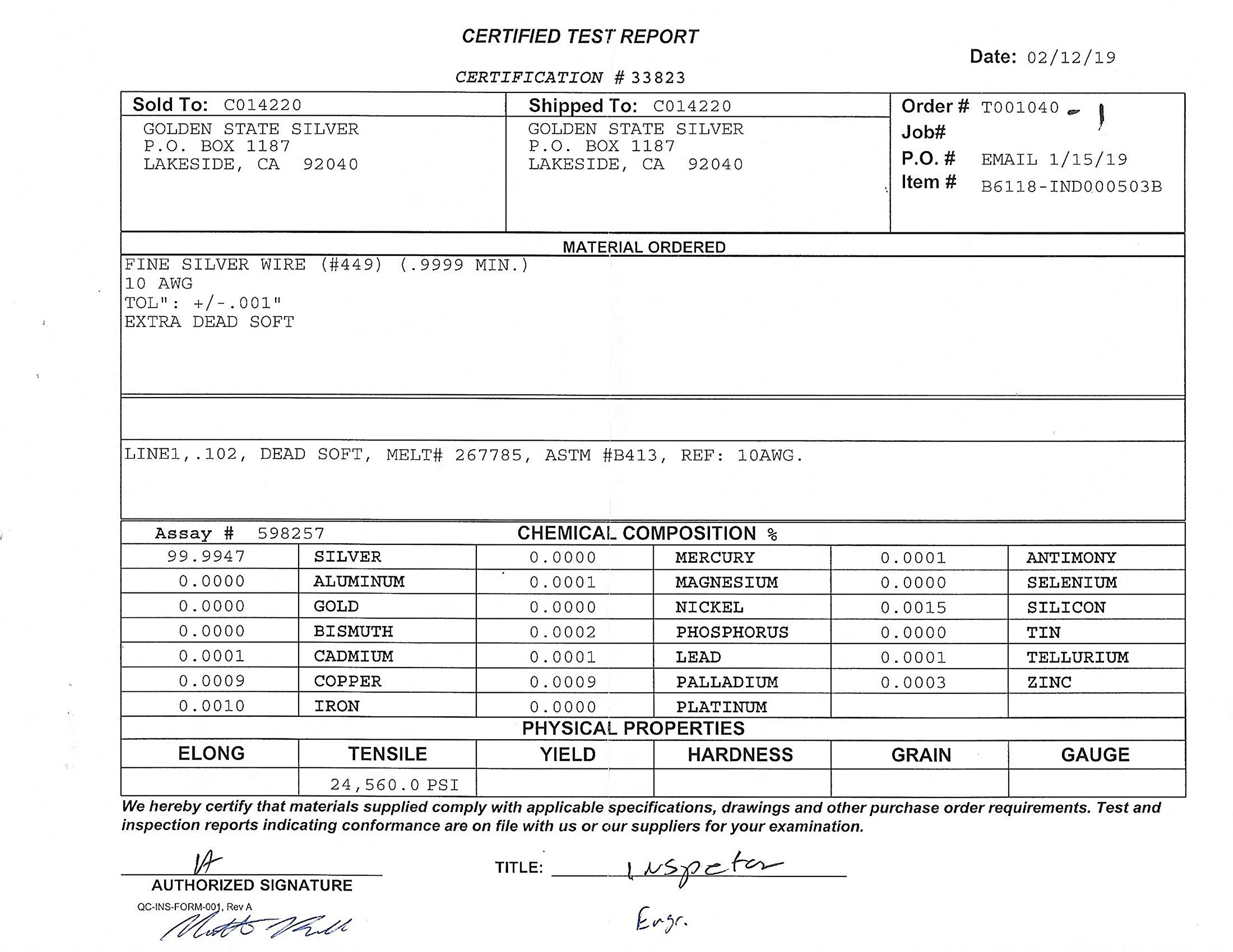 Certificate of Assay is included with every order