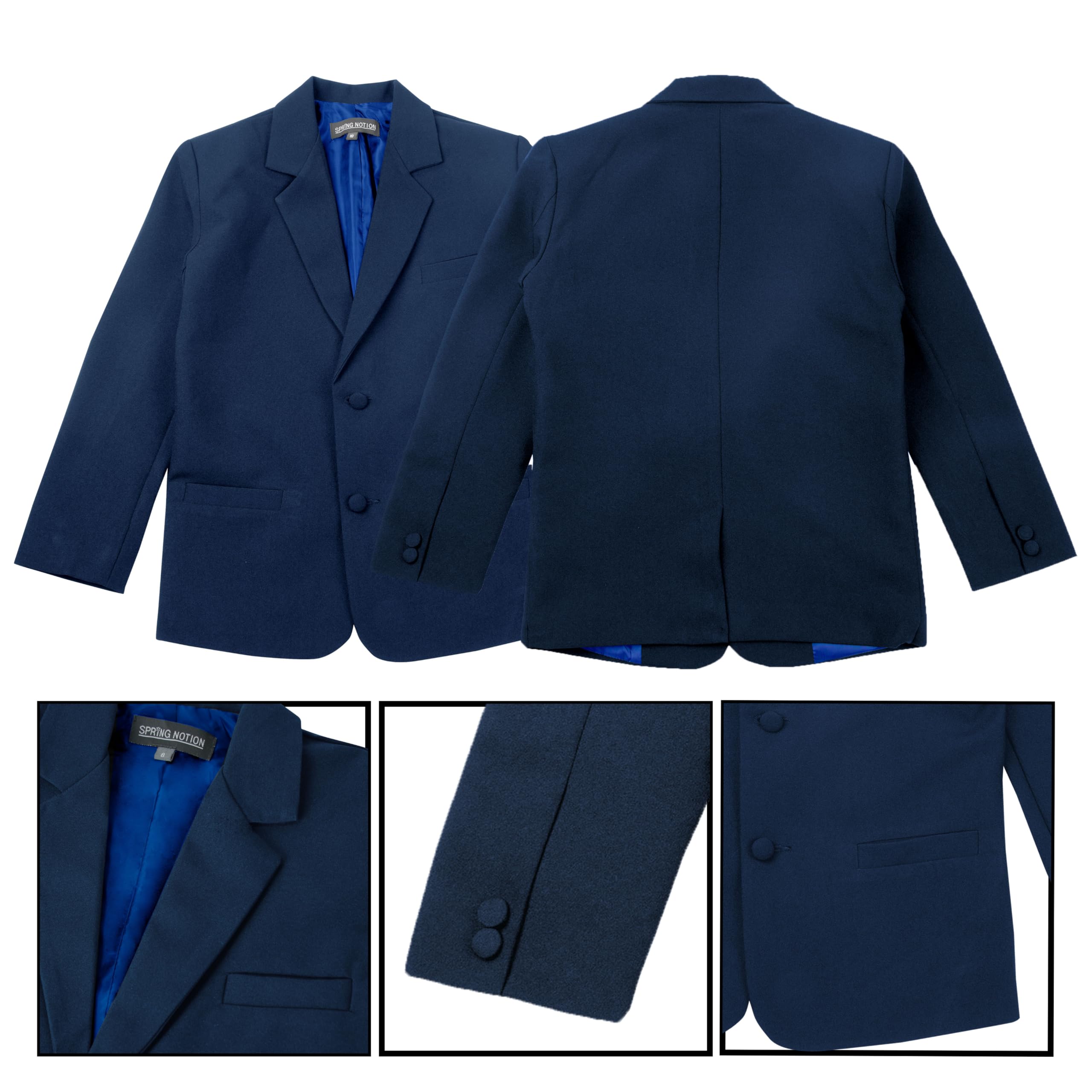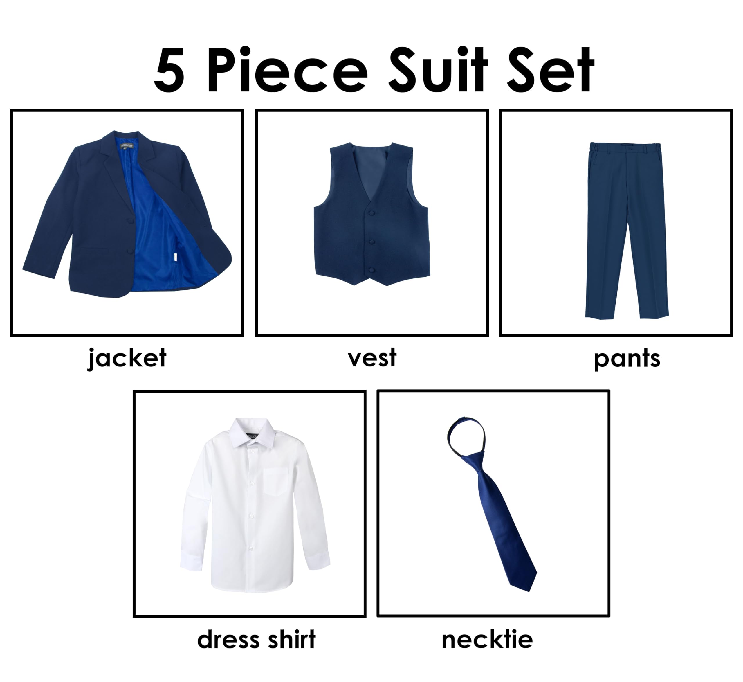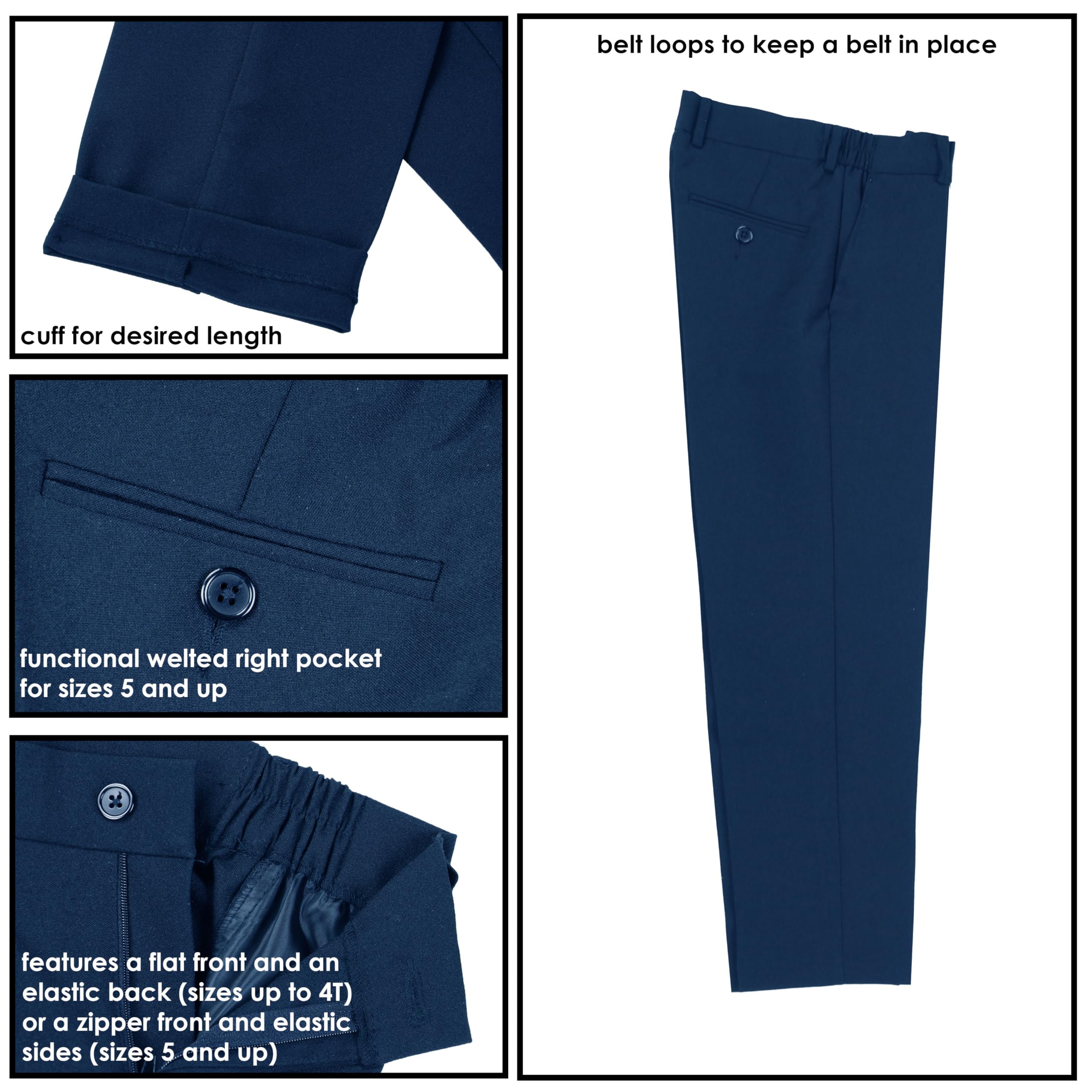Vest is fully lined with light weight polyester back. For sizes up to 6, the necktie is a clip-on style, while for sizes 7 and above, it features an adjustable buckle closure for ease of wear. The pants feature a flat front design with an elastic back, offering both style and comfort for your little one.