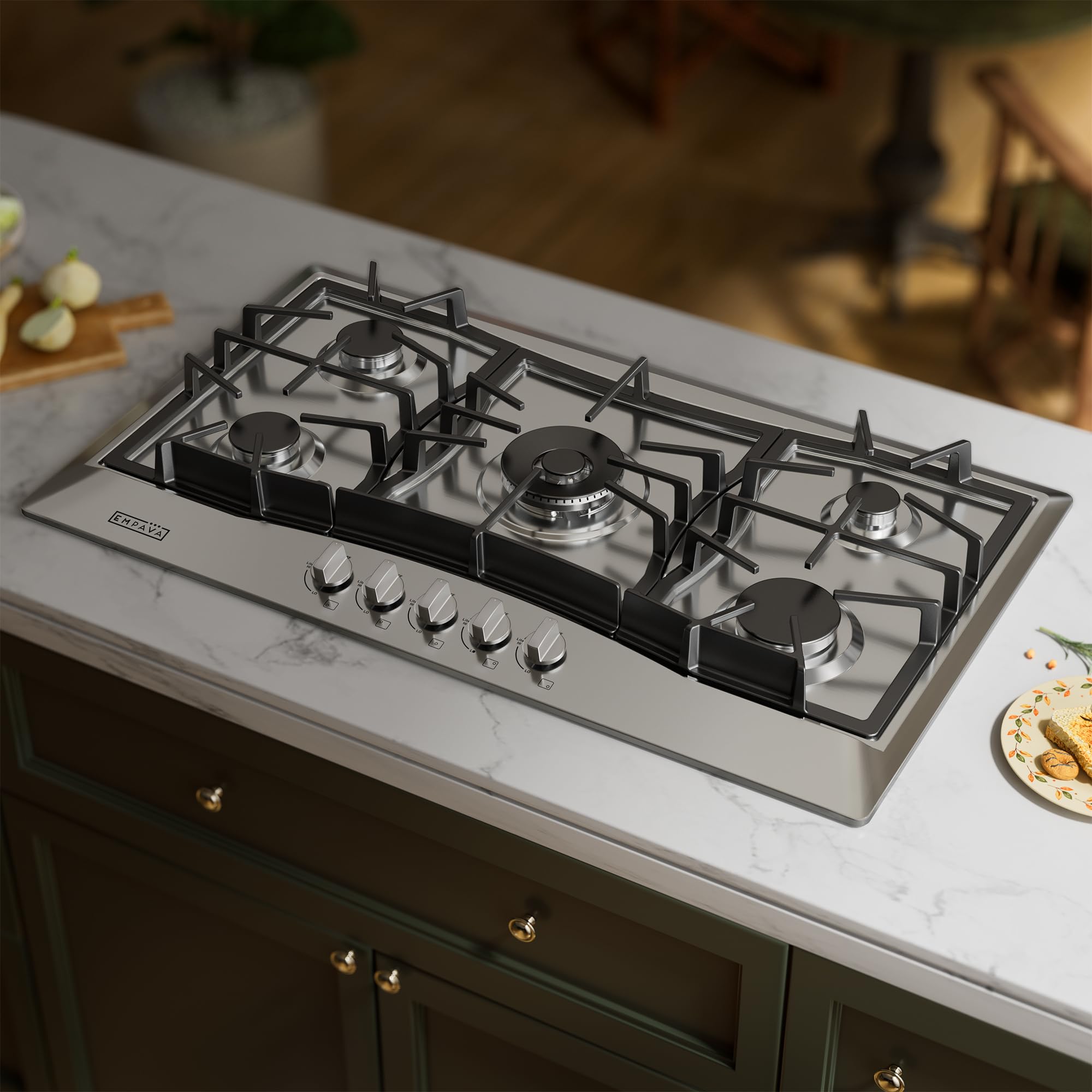 Reliable Dual Fuel System: This 36 inch gas cooktop is pre-installed for natural gas and easily convertible to propane (LPG kit included). The advanced 120V auto electric pulse ignition ensures quick start-ups, while manual operation allows for flexible indoor or outdoor setups.