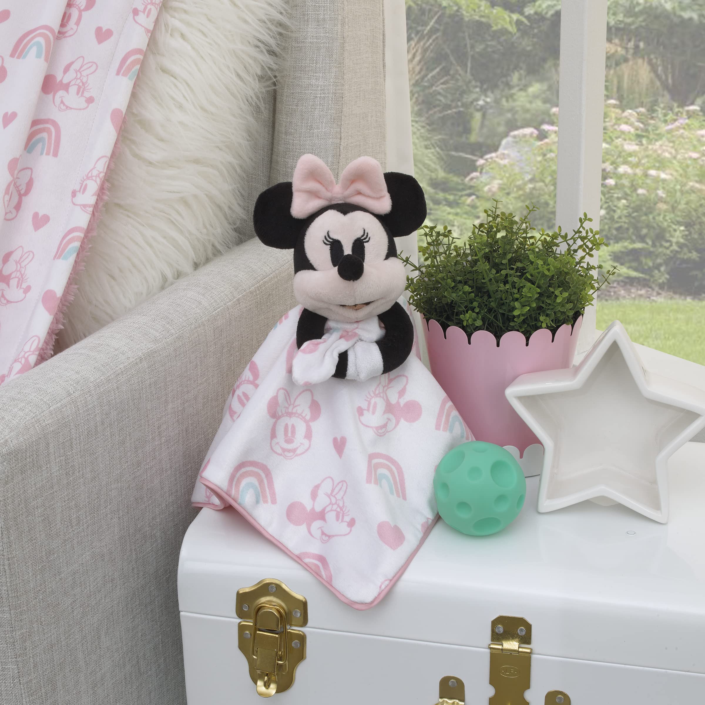 Comfort your baby with the Disney Baby Minnie Mouse Lovey Security Blanket! This super-soft lovey features a plush Minnie Mouse attached to a 13" x 13" white, pink, and aqua blanket with a fun rainbow and hearts print. Made of snuggly soft fabrics and makes a great baby shower gift! Easy to carry for baby and great for on the go!
