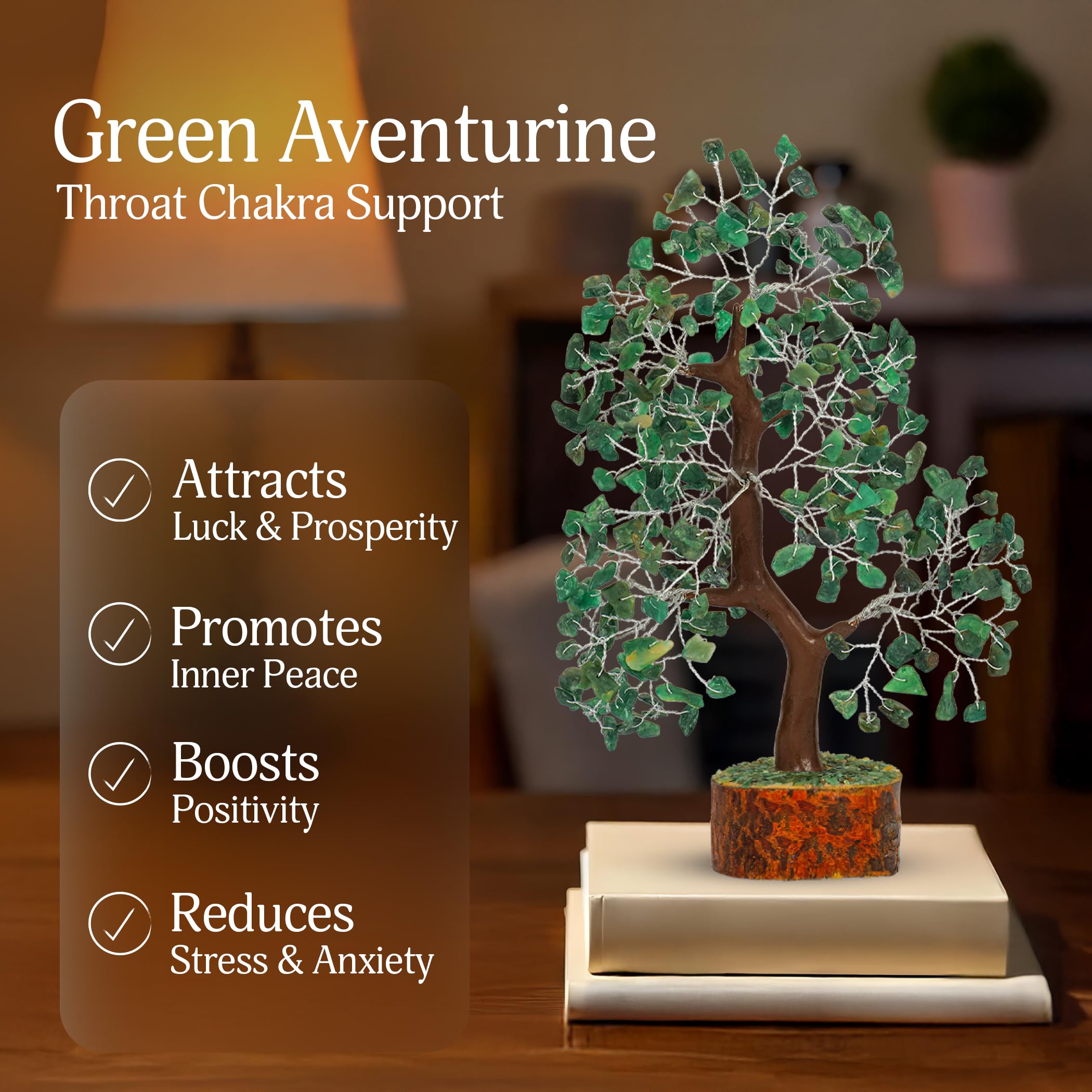 Green Aventurine Crystal Tree - A wonderful chakra healing masterpiece from the coasts of India. From a crystal gemstone to the final product, with pure craftsmanship, this reiki crystal tree is filled with healing energy. Symbolizing like a blooming tree, this feng shui bonsai figurine's branches are beaded amidst natural green aventurine chakra stones. Base of this home decorative item is made from wood. The trunk & branches are built from silver wires, making approximately 10-12 inch tall