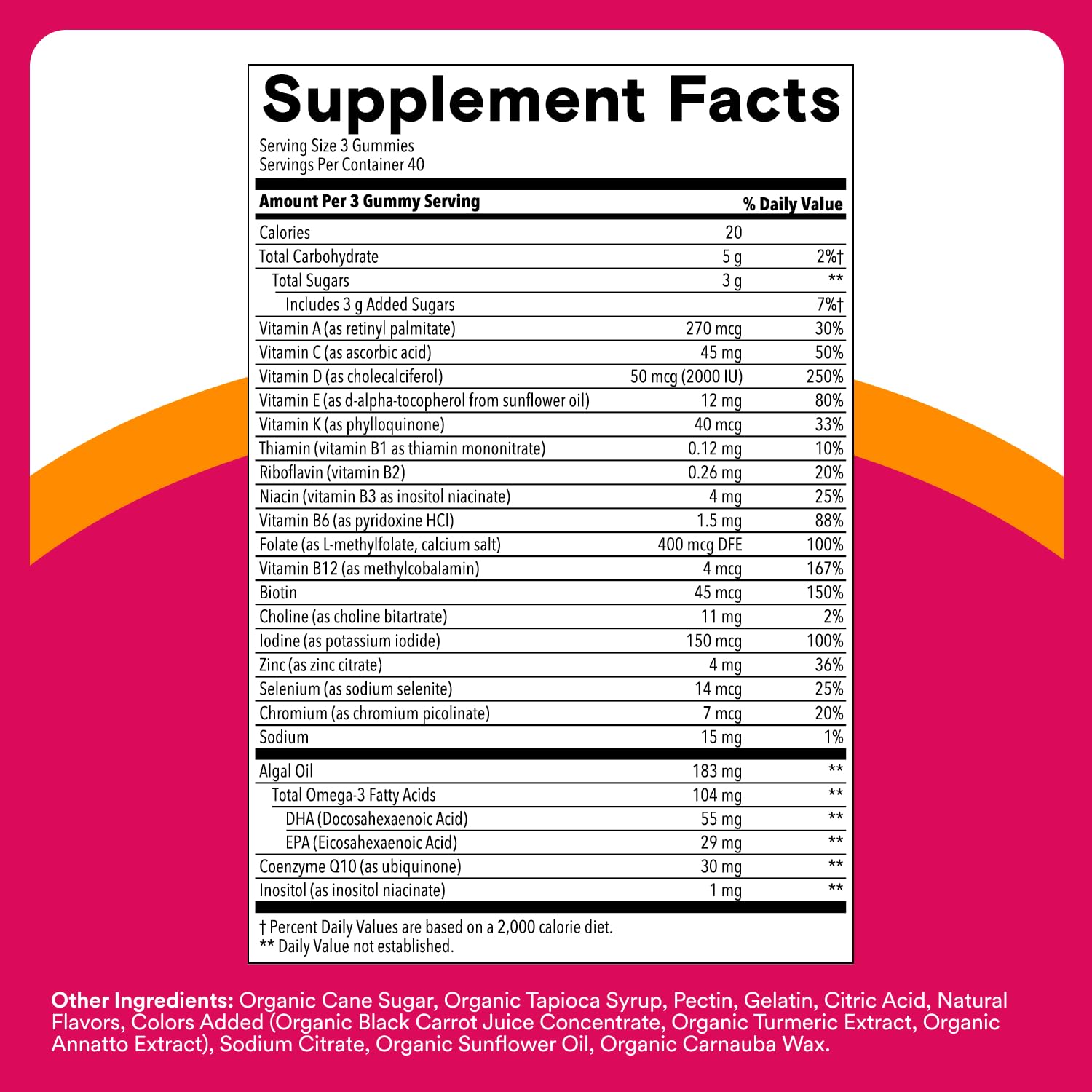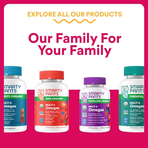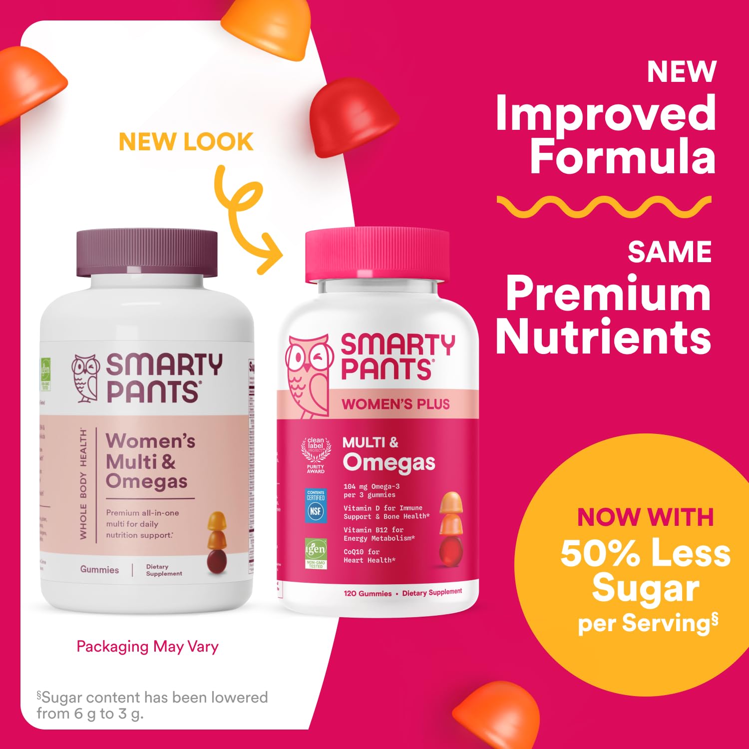 New and improved SmartyPants Women’s Plus Multi & Omegas is a premium, multifunctional gummy supplement that contains more of the nutrients you want in a delicious format that is easy to take! Each serving delivers a robust blend of vitamins and nutrients including omega-3 DHA and EHA from algal oil, CoQ10, folate in the premium form, methylfolate, to help form red blood cells*, biotin to help maintain healthy hair, skin, and nails* and iodine for thyroid support* all in one easy and delicious serving.* We use nutrient forms that your body can easily use to help to fill nutritional gaps and support overall good health.* Our formulas are non-GMO and made without any synthetic colors, artificial flavors or sweeteners. *Based on $ Sales, IRI InfoScan, and MULO, 06/2023-06/2024. **Gummies per serving have decreased from 6 gummies to 3 gummies and the sugar content has been lowered from 6 g to 3 g per serving.
