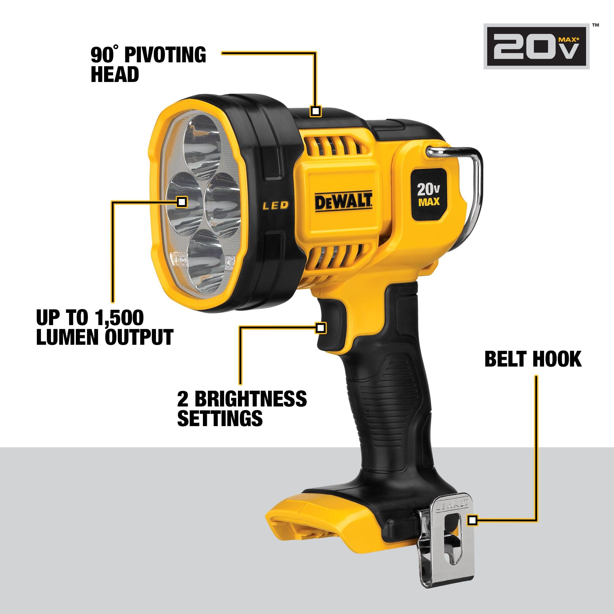 Illuminate dark jobsite work areas with the DCL043 20V MAX* Jobsite LED Spotlight. The LED rechargeable work lights feature two brightness settings for flexibility, pivoting head and belt hook for versatility, and over-molded lense cover for durability.
