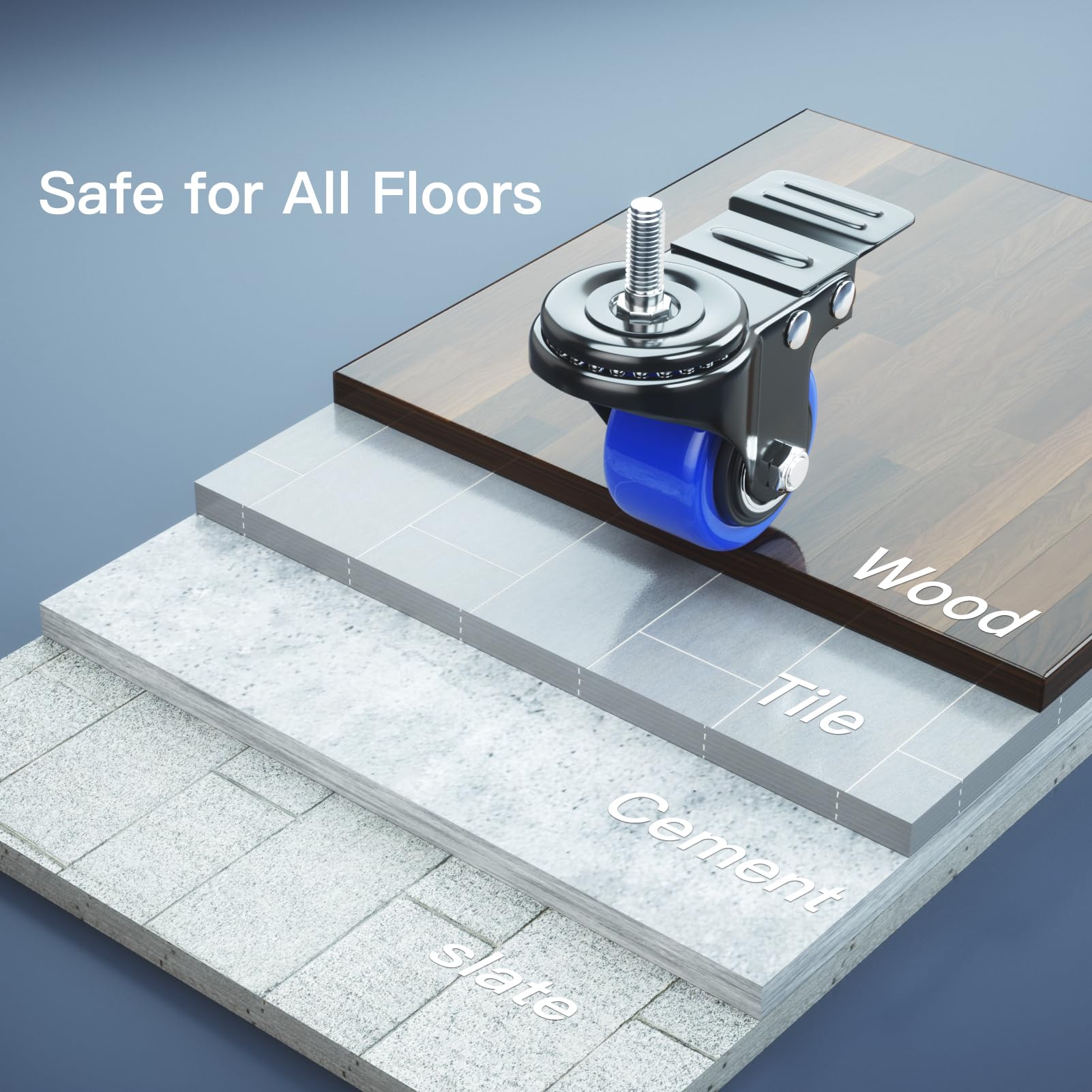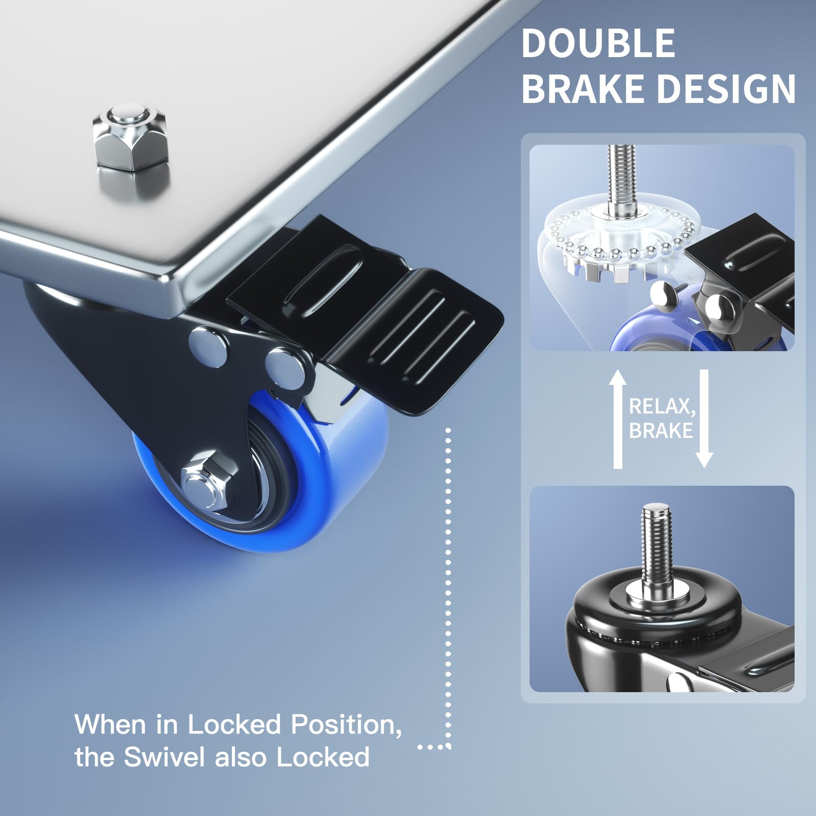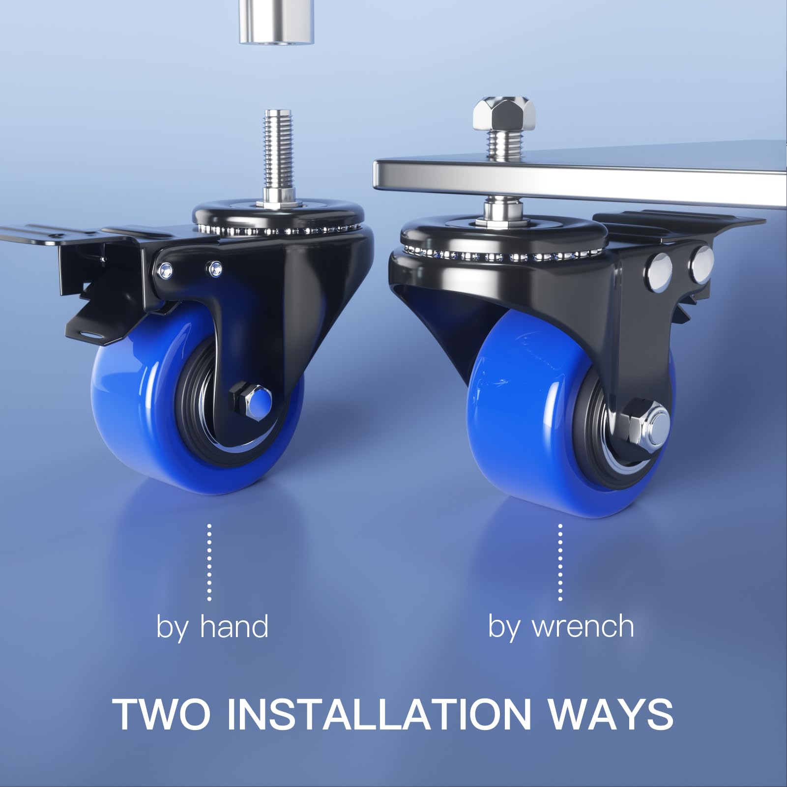 DOUBLE SAFETY BRAKE: Our top plate swivel caster wheels can locks the wheel and the swivel simultaneously, holding the equipment firmly remain in place when the threaded casters are locked. Locking casters design make it more safe when used as rolling workbench casters, industrial casters, heavy-duty casters, especially on uneven surface.