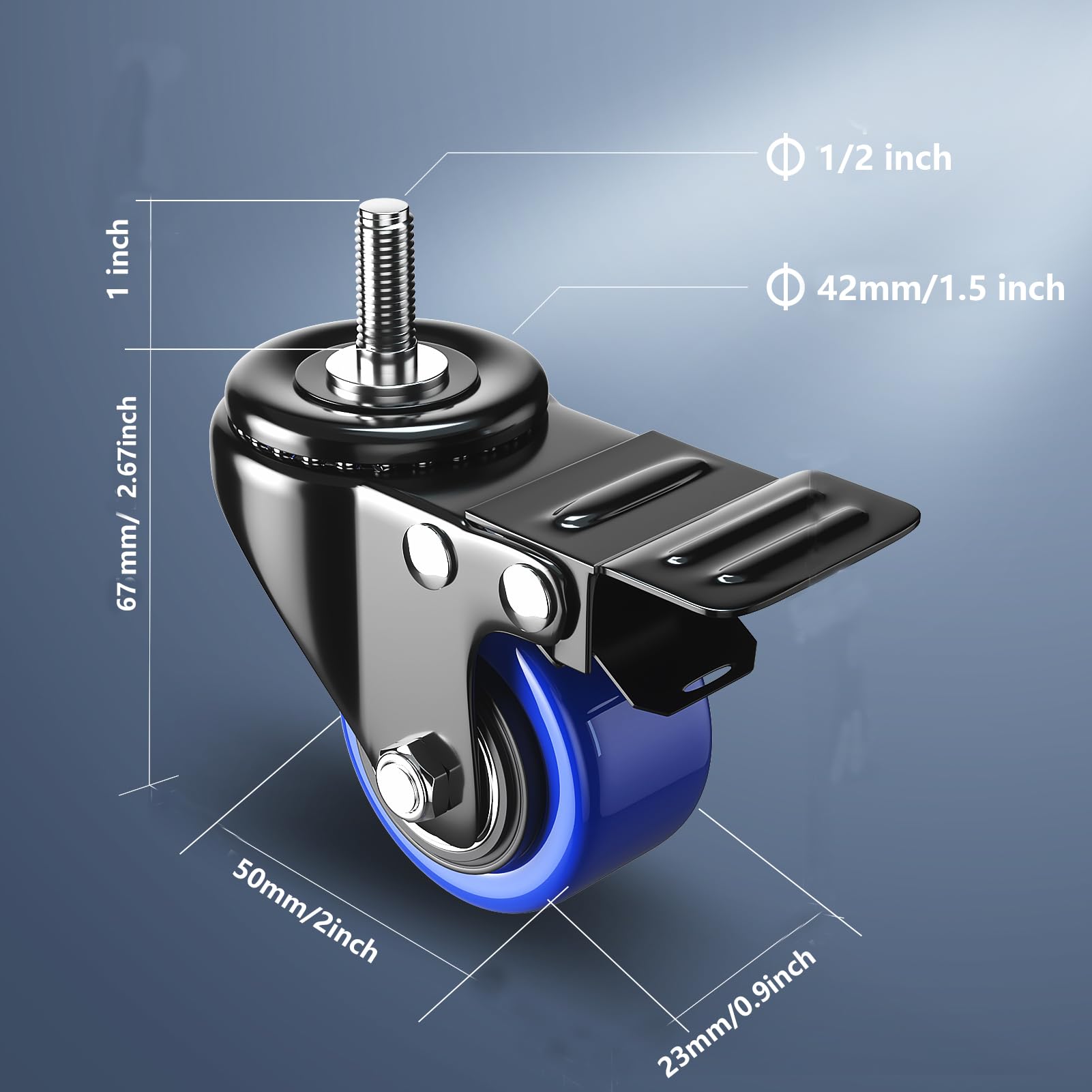 STANDARD AMERICAN SIZE 1/2" -13UNC x 1": Threaded caster wheels Diamater: 1/2", Stem Length 1", thread dual locking heavy duty caster wheels with brakes easy to install with included mounting hardware, 4 nuts, 4 washers, and 2 spanner, please confirm the required screw specifications before purchasing the stem caster wheels.