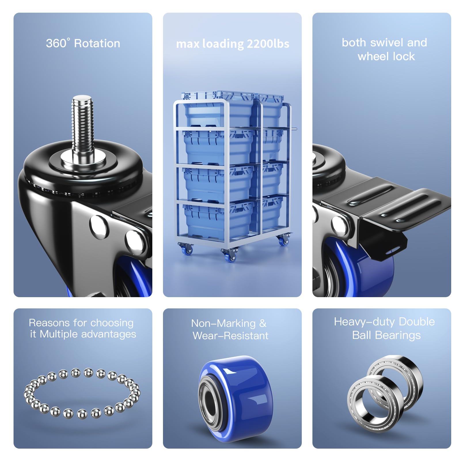 STURDY CONSTRUCTION CASTERS SET OF 4 HEAVY DUTY: Housing made of heavy duty steel for high load, adopted industrial-grade electrophoresis plated steel, precious ball bearings, is extremely hard wearing and resistant to dirt. Each 2 inch caster supports 200 lbs. of load (with a 800 lb. total capacity for four wheels). The swivel casters make the work labor-saving and much more easier to finish.