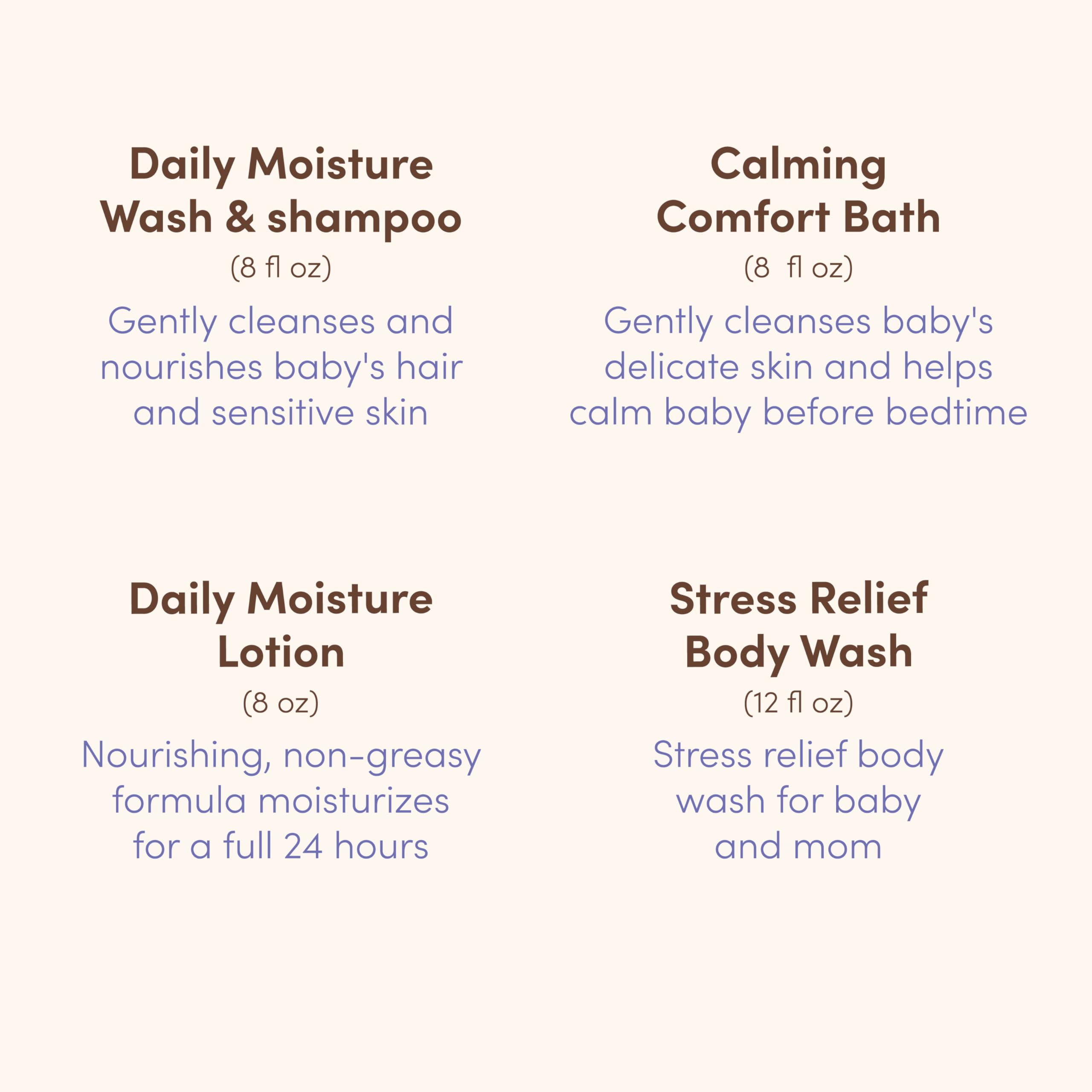 Mommy & Me Bath Essentials: 4-piece gift set includes baby daily wash & shampoo, calming bath & wash, daily moisture baby lotion, plus a stress relief body wash for mom; reusable wicker basket for storage; Pediatrician & Dermatologist Recommended