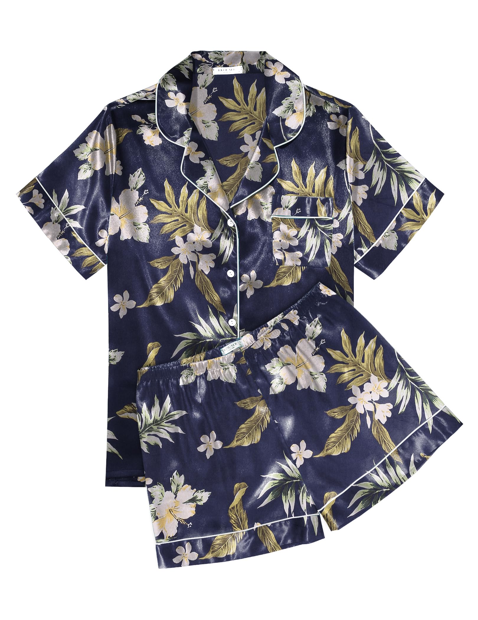 Elegant design:Short sleeve pajama tops, button down front,notch lapel collar and one chest pocket.Matching pajama shorts for women with stretchy elastic waist that fits for any body size.Lightweight and Breathable,perfect for sleeping, lounging, or morning coffee in effortless grace