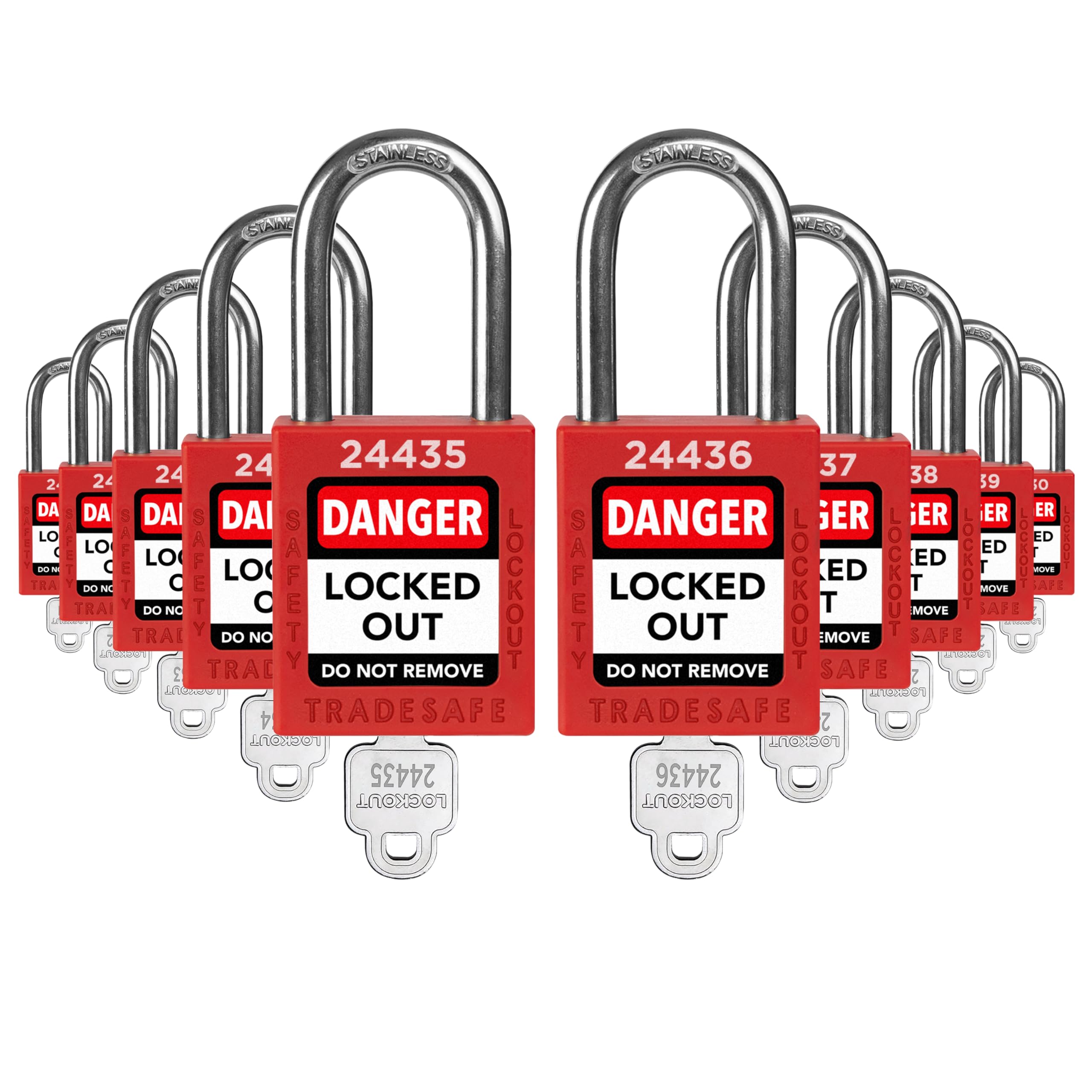 Premium Tagout Lock - (10) Red lock out tag out locks with 1-1/2 inch long stainless steel shackle, 1/4-inch shackle diameter, 1 key per safety lockout lock; matching code on padlock body and key, each lock in the pack has unique numbers