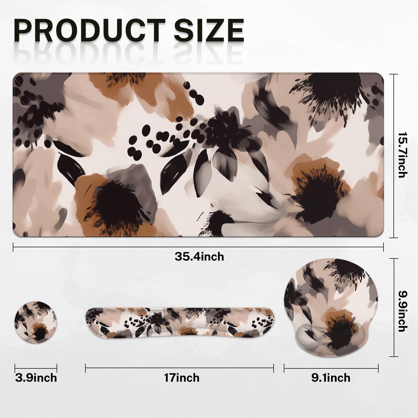 Comprehensive 4-in-1 Mouse Pad Set:This all-inclusive mouse pad set offers a large desk pad (35.4x15.7inch),a keyboard wrist rest (16.9x3.3inch),a mouse wrist rest (9.8x9.1inch),and a cup coaster (3.9x3.9inch).All these accessories come together at an incredible value,saving you the hassle and expense of separate purchases.This spacious desk pad can accommodate your mouse,gaming keyboard,and other desk essentials,while maintaining aclean.