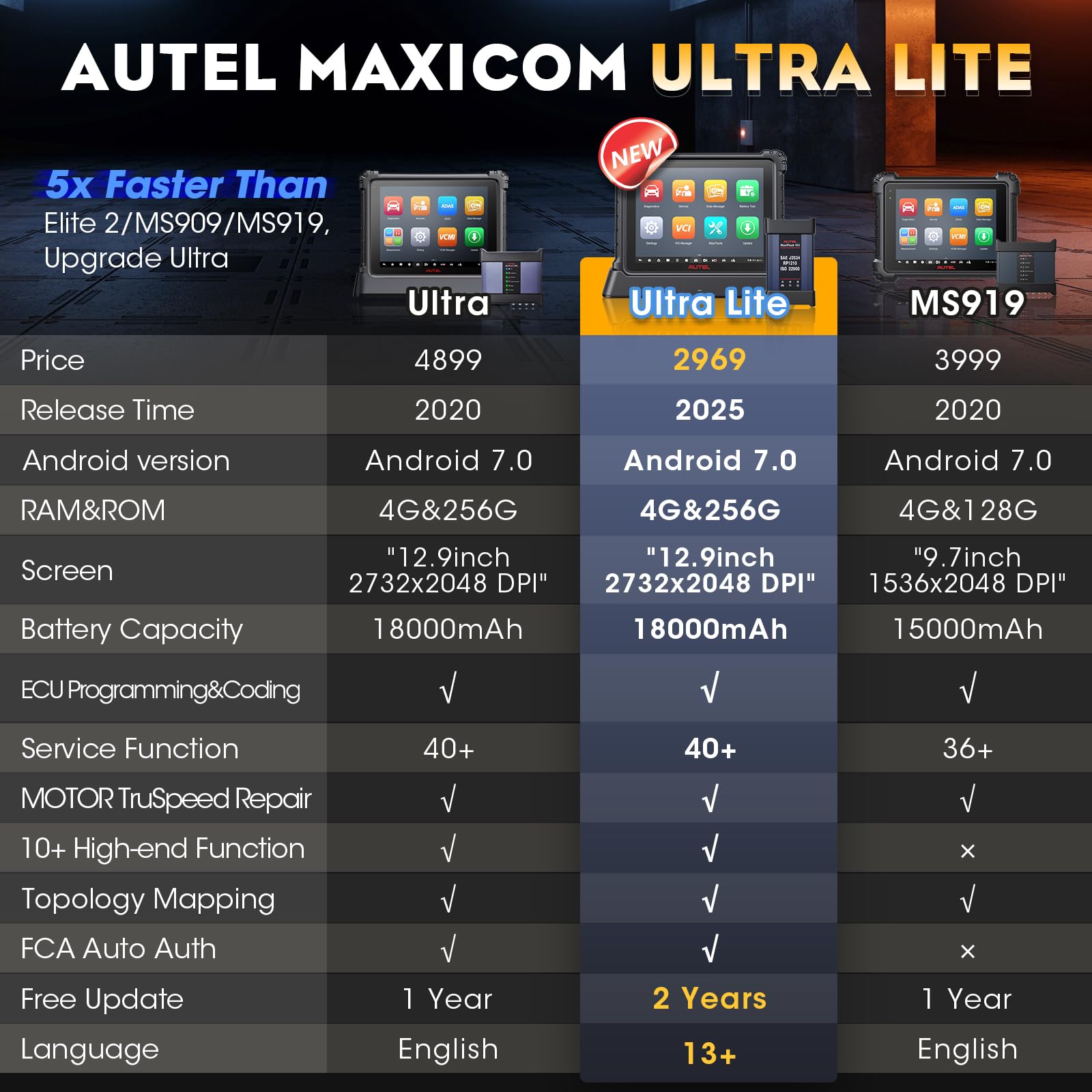 🥇【2 Years Update, Surpass Ultra Ultra S2 MS909 MS919】Autel MaxiCOM Ultra Lite enjoys 2 Years update, better than Ultra MS909 MS919(only 1 year), save 2500+ bucks,