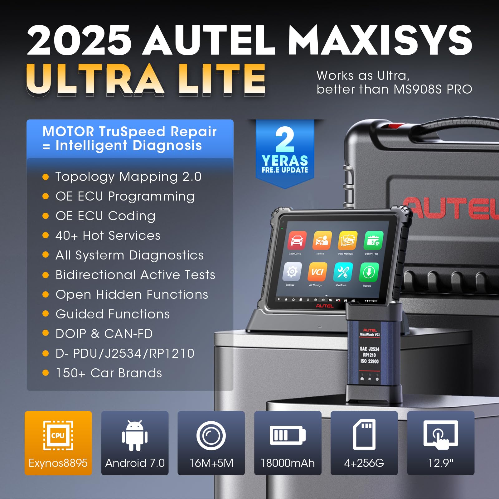 ● 📣【Autel Ultra Lite is the Best Choice】Autel Ultra Lite is the 2025 most promising diagnostic scan tool combining the advanced features and the top-of-the-line hardware of MaxiSys Ultra/Elite 2 Pro/ MS909/MS919. Cover 15,000 models worldwide, and provides newly added Motor TruSpeed Repair (Intelligent diagnostics 2.0), topology mapping 2.0, local-smith level J2534 programming & coding, 40+ resets, bi-directional active tests, luxury Car Diagnostics,10+ high-end functions... This Autel Scanner