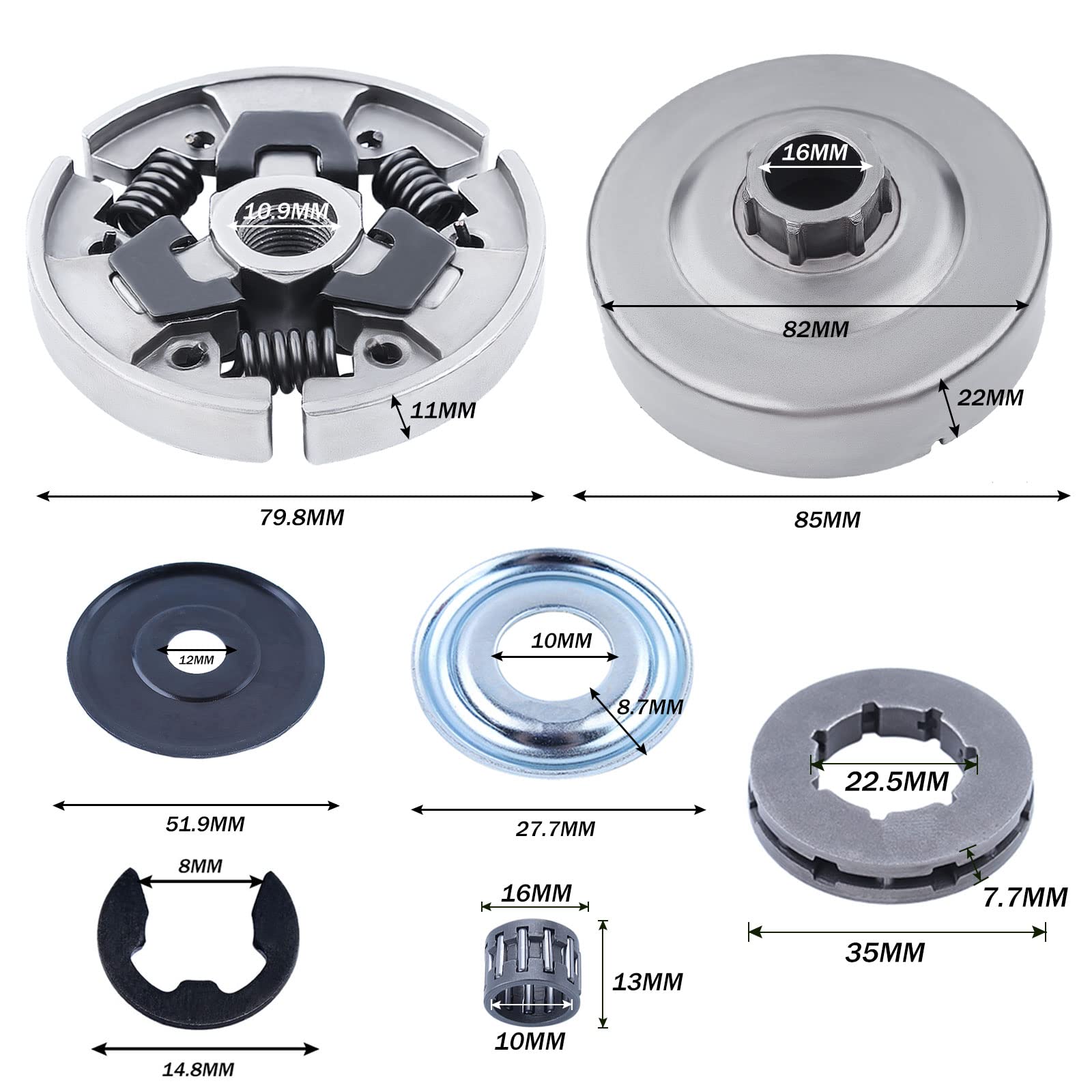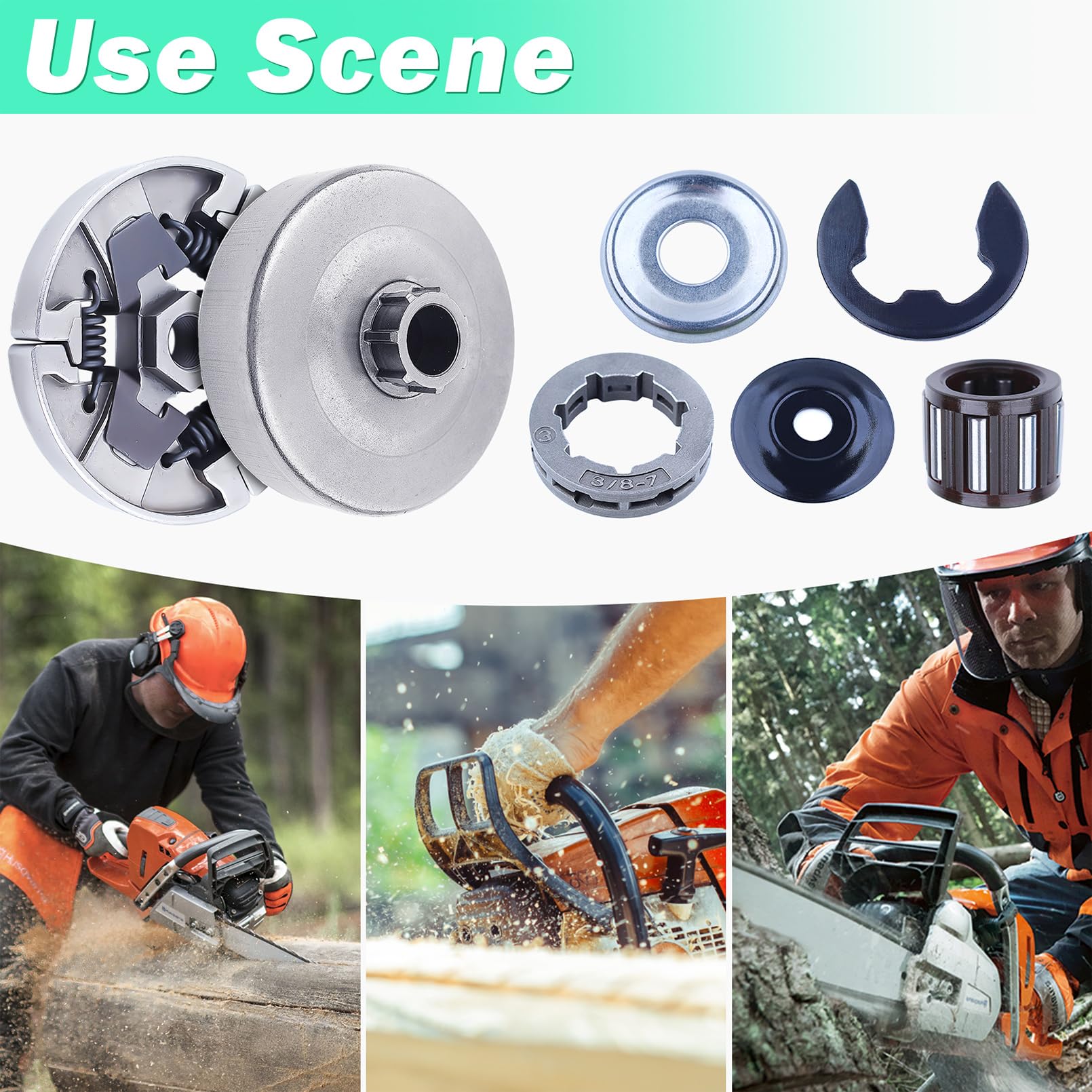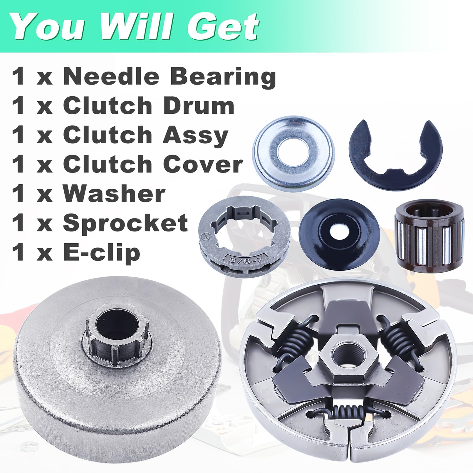 【Package Includes】1 x MS661 Clutch Drum, 1 x MS661 Clutch Assy, 1 x Clutch Cover, 1 x Washer, 1 x Sprocket, 1 x E-clip, 1 x Needle Bearing.( Rim Sprocket: 3/8"Pitch, Standard 7 Spline, 7 Tooth. )