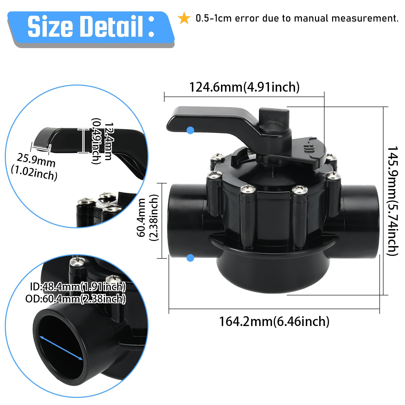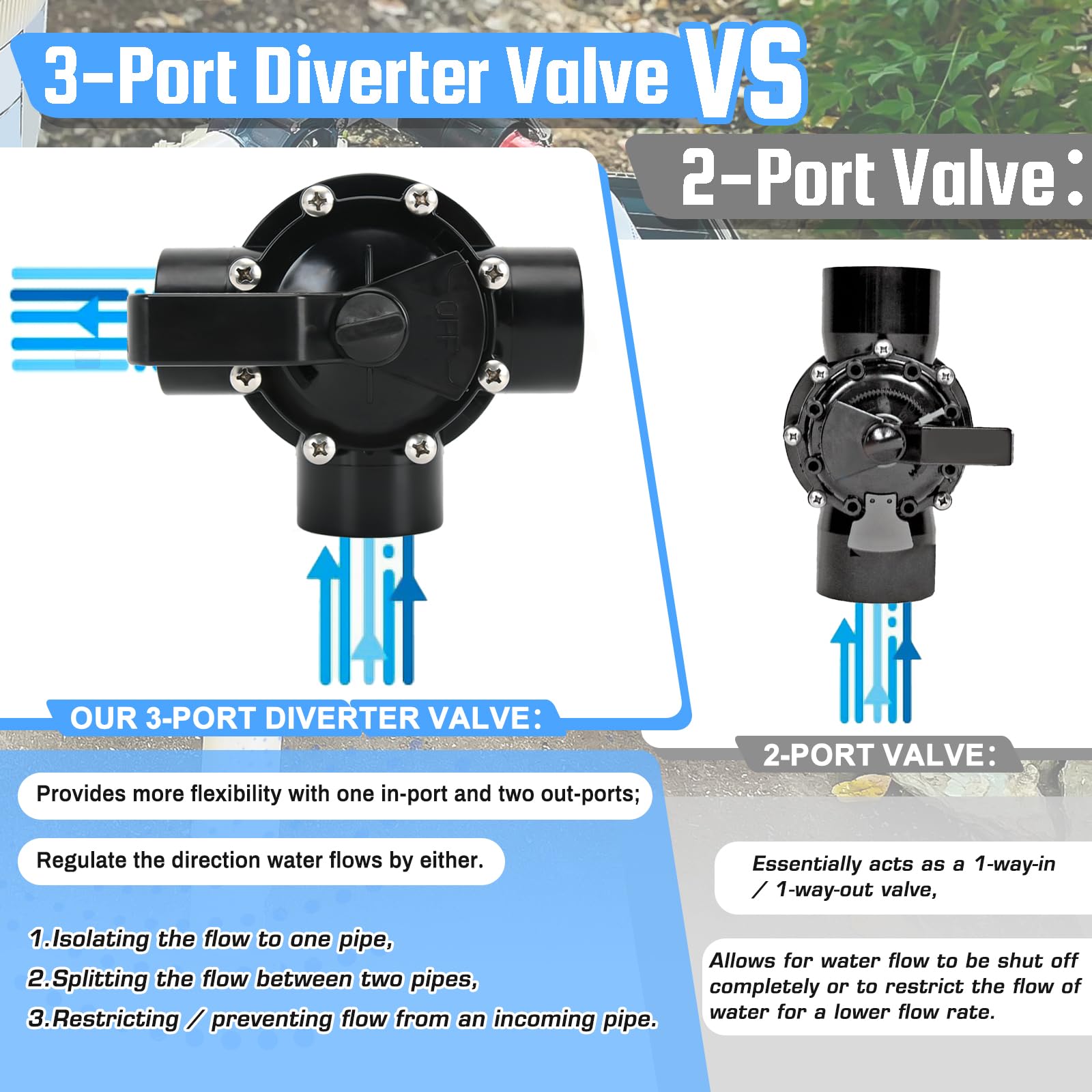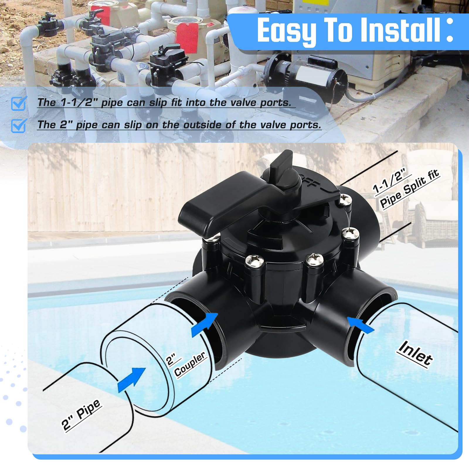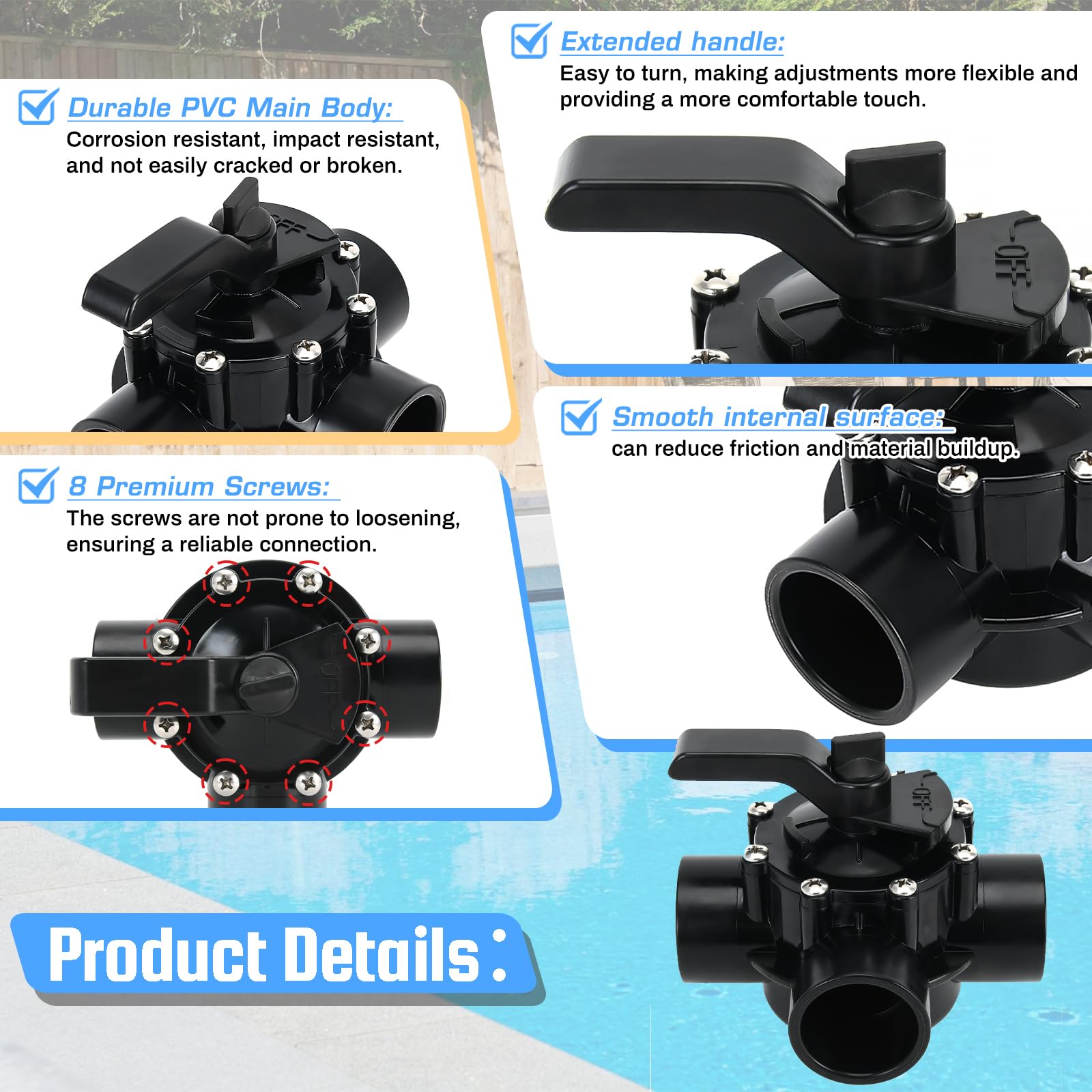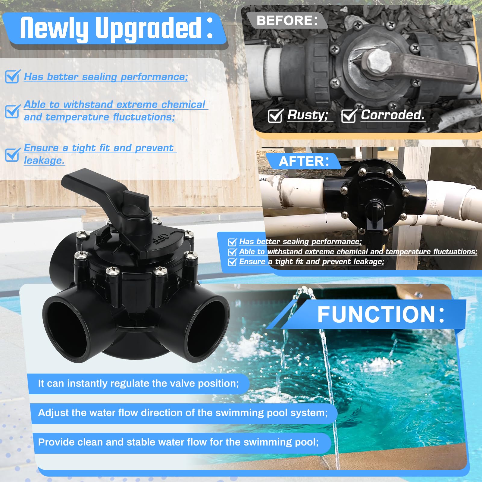 【FUNCTION】: This diversion valve is used to turn, close, or mix water flow, and can regulate the valve position in a timely manner, help you to clean you pool quickly and efficiently. It also features a positive seal design that ensures leak-free operation, even at high pressures
