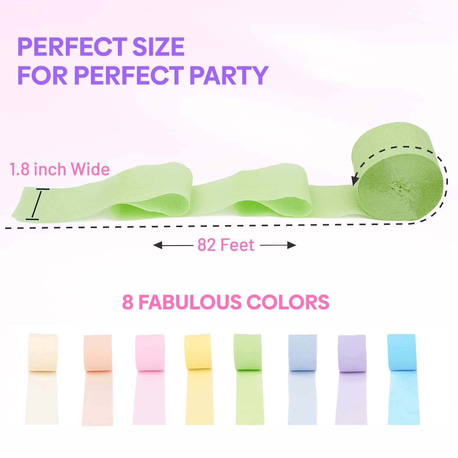 Vibrant Streamers multipack of 8 crepe paper streamers, perfect for pastel rainbow party decorations. Includes Cream, Soft Peach, Pale Yellow, Light Pink, Mint Green, Lavender, Soft Purple, Light Blue good for pastel rainbow decor. Each roll 82 ft long and 1.8" wide.