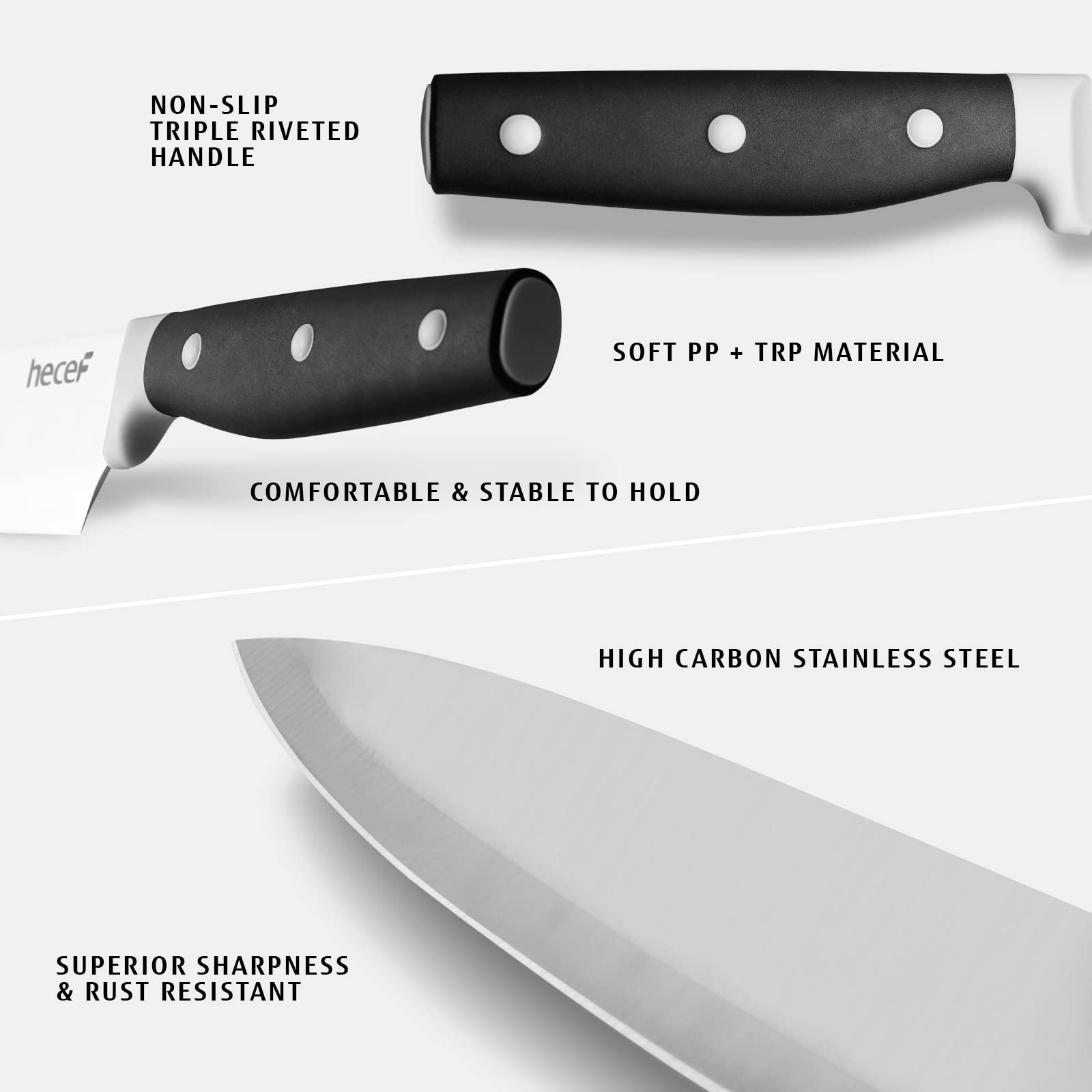 Stylish & Ergonomic Handle: Injected with PP+TPR material, this triple riveted handle is sturdy that will never take apart and ensures good kitchen experience. Meanwhile, the color of handles are specially designed to match with our knife block and most of the kitchen.