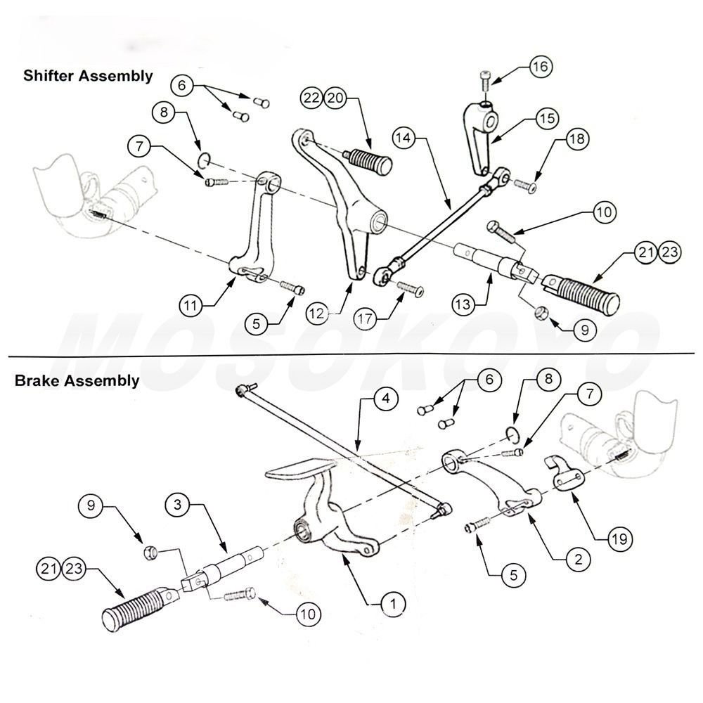 Aftermarket 100% Brand New; Complete assemblies for both brake and shifter sides. Kit includes pegs, levers, linkage and hardware; Made from steel and aluminum.Mounts easily to front motor mounts.