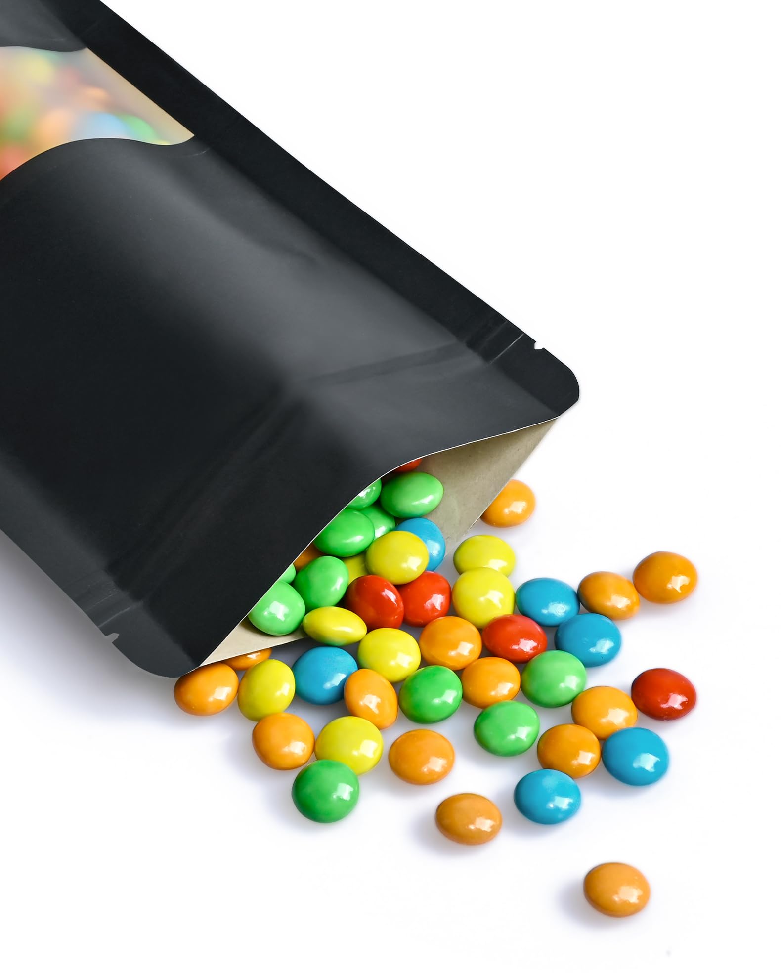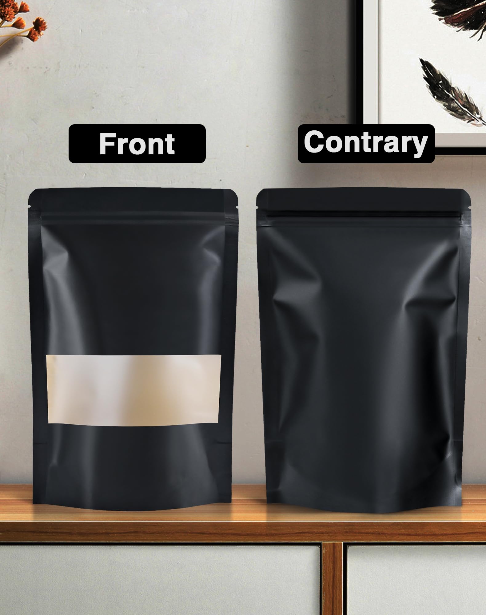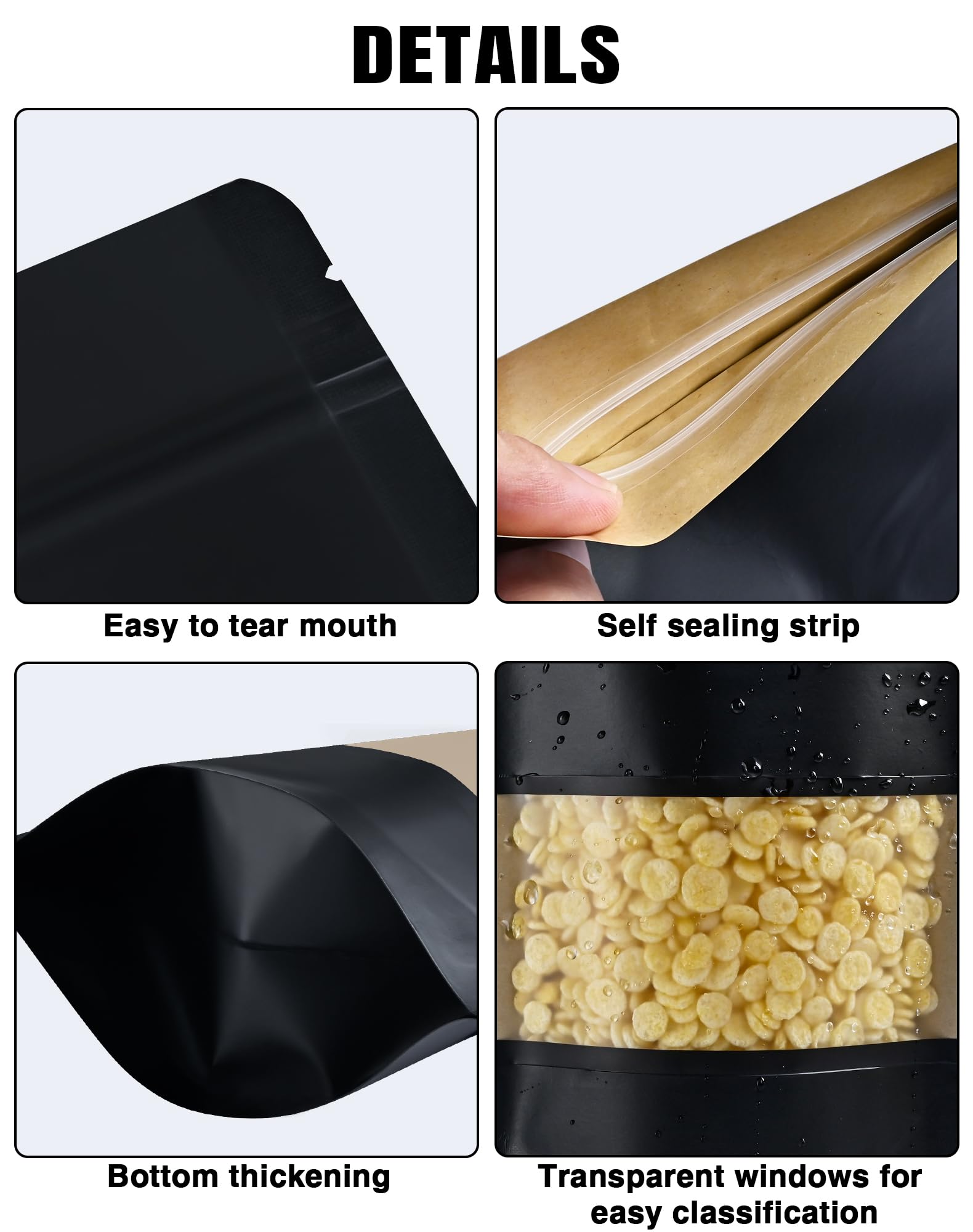 【Quantity & Material】Package include 100 pieces black kraft stand up pouches. Outer dimension:4.7*7.9 inch,Inner dimension:4.1*4.9inch; Made from food grade kraft paper and plastic, which is odorless, reusable and moisture proof, keeps your products freshness.Practical bags for packing product.