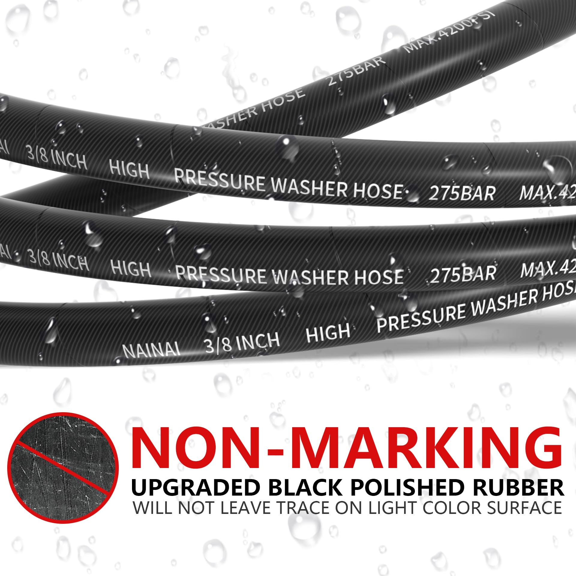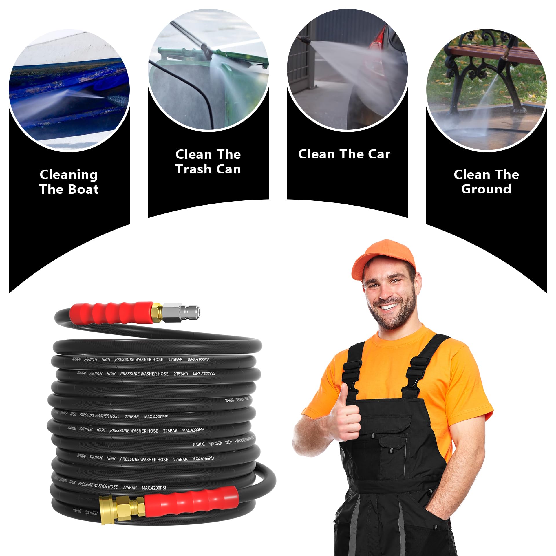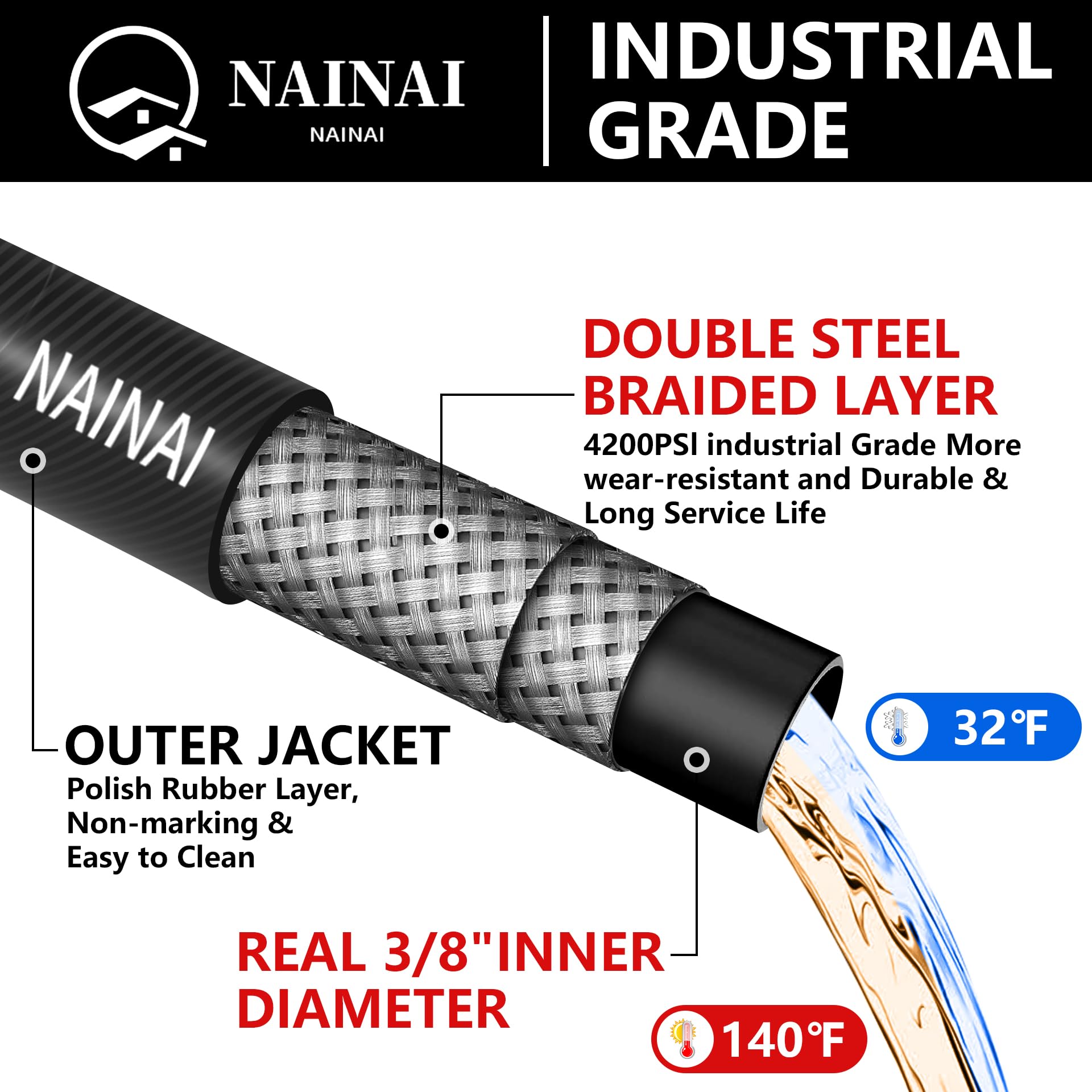 4.【Widely Use】:NaiNai pressure washing hose compatible with both hot & cold water usewith working temperature 32°F-140℉, Great for commercial and householo cleaning needs, To wash cars, Motorcycles, Machinery, Floors, Driveways,Roofs, Factories, Swimming pools, Siding during all seasons.