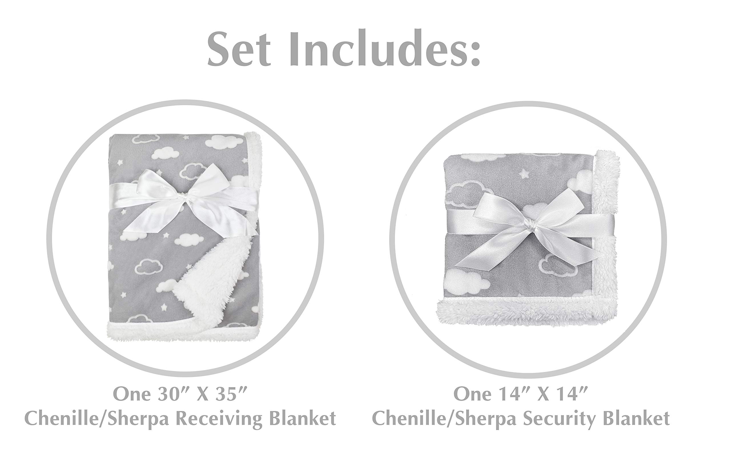 This great blanket set contains one receiving blanket that is 30" X 35", and one security blanket that is 14" X 14". They are ultra soft and cuddly blanket for your baby amd they are perfect baby shower gift. Machine wash in cold water and dry on lowest temperature setting.