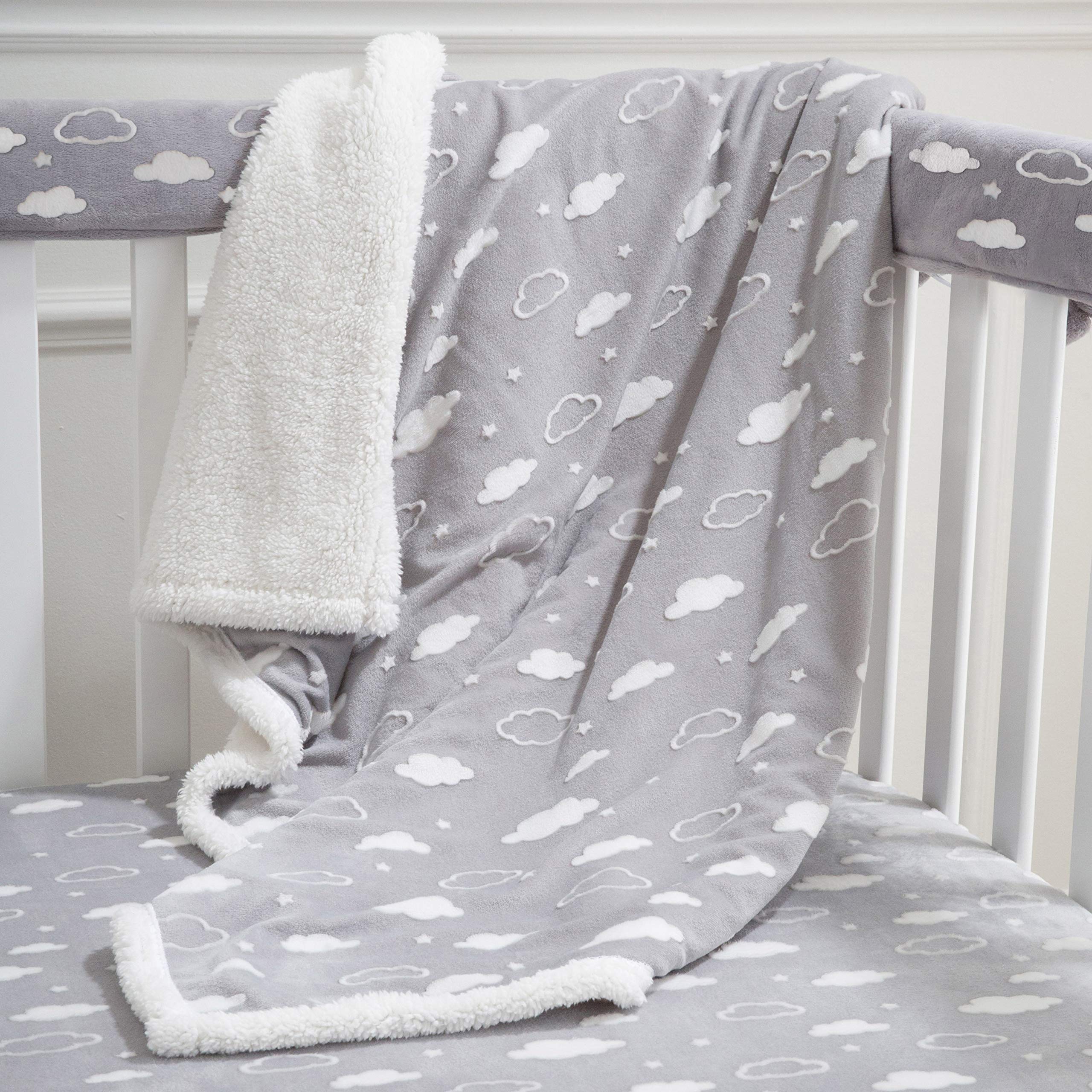 Receiving blanket: front and back: 100% extra soft and cuddly Sherpa/chenille with 1" trim. Generously sized at 30 x 35 inches