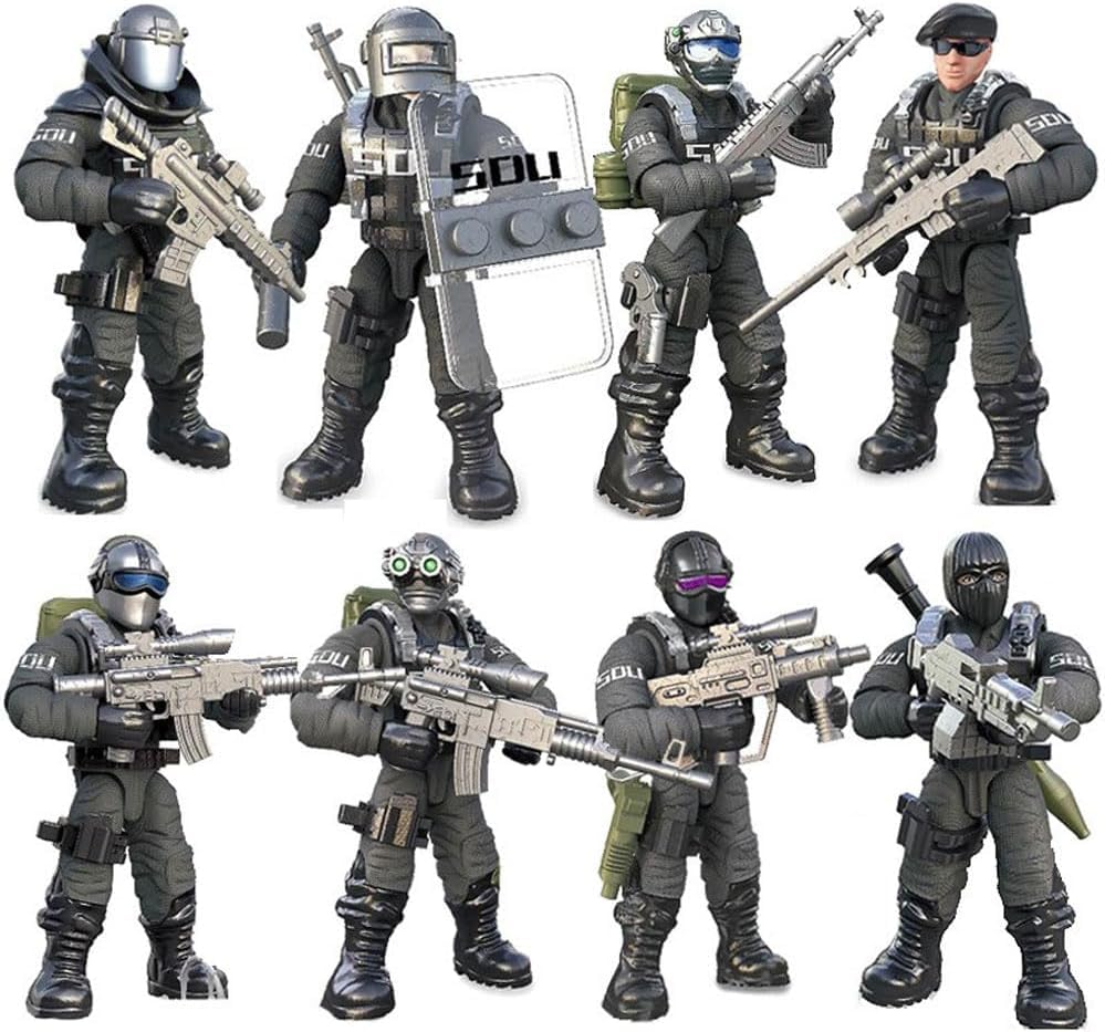 【High Playability Mini Soldiers】Mini size action figures, 1:36 scale, each measures about 2.2" tall, figure can stand alone. 8 SWAT combat soldier action figures have excellent quality and very good details, such like armed military belt, helmet, ammo pack, bulletproof vest, etc. The more important is movable joints. Every army men can be bend, sit, stand, turn their heads, move their arms and legs.