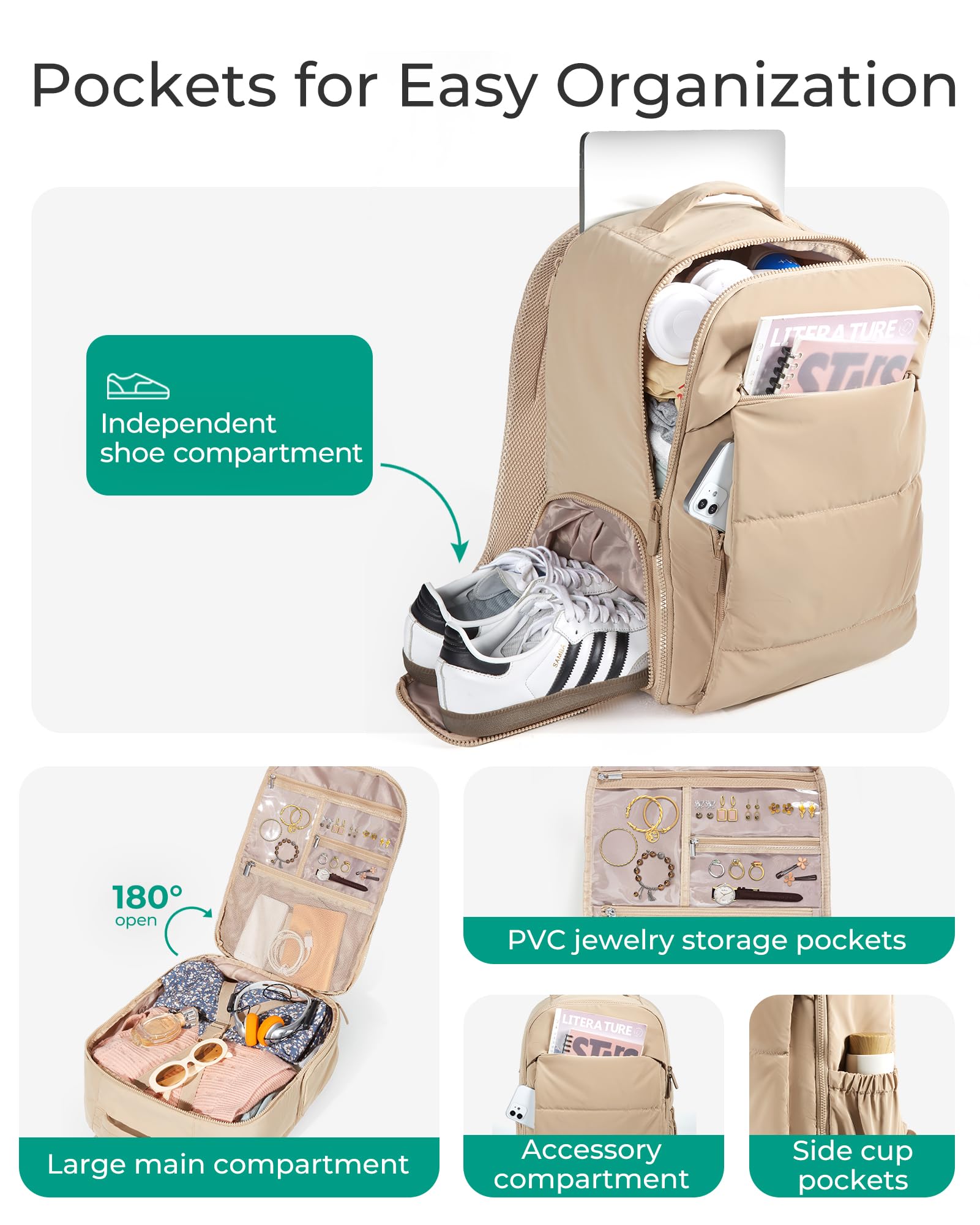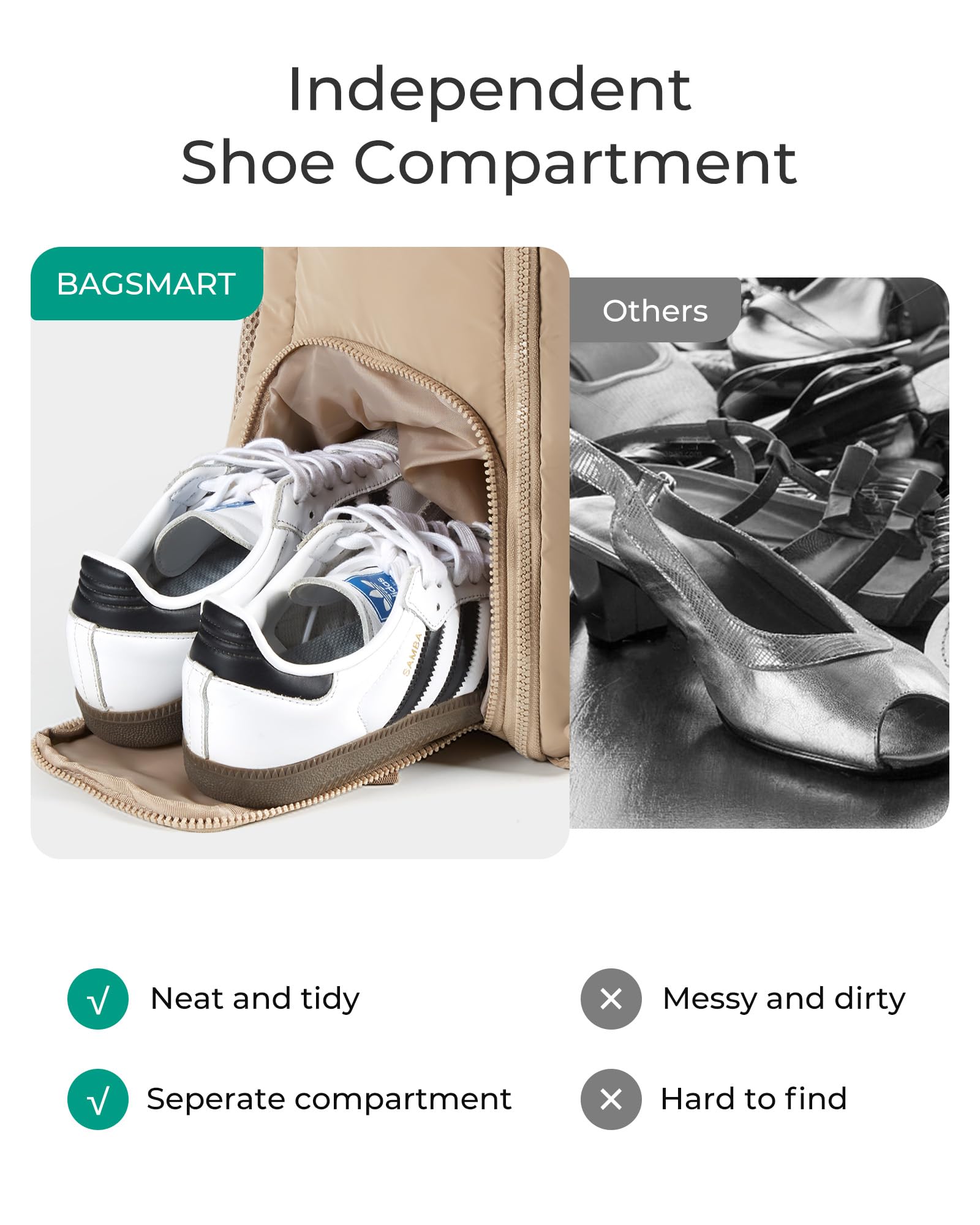 Practical Features: A separate shoe compartment on the side maintains cleanliness and organization. The Padded 15.6" laptop compartment towards the backside, keeps electronics easy to access and provides reliable protection against impacts. Additionally, the back strap conveniently fits over a suitcase handle for effortless transport