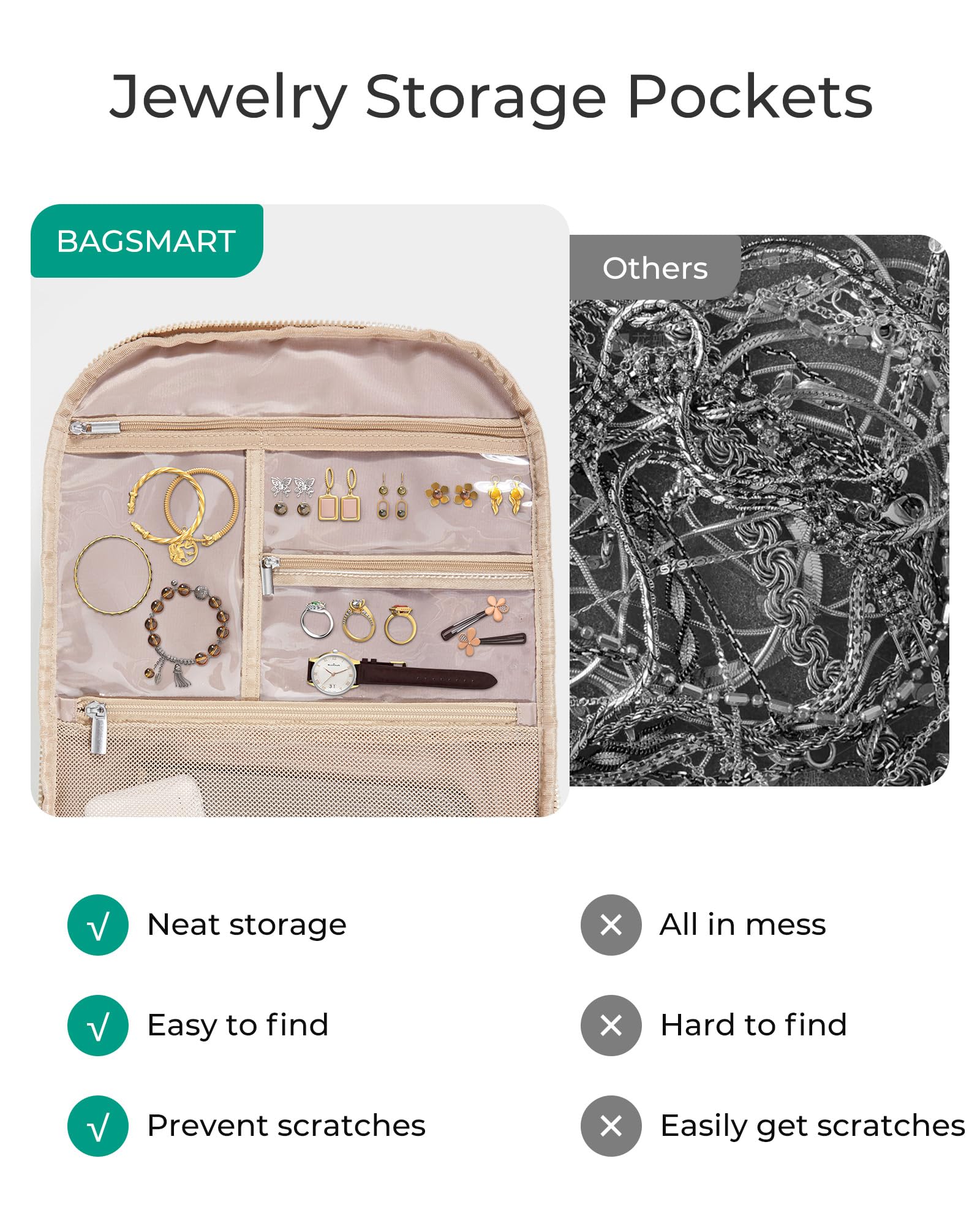 Jewelry Safekeeping: Our carry on bag offers PVC pockets for jewelry storing, different sizes transparent pockets keep your belongings separated and always find the jewelry you need. Bid farewell to rummaging through a chaotic bag