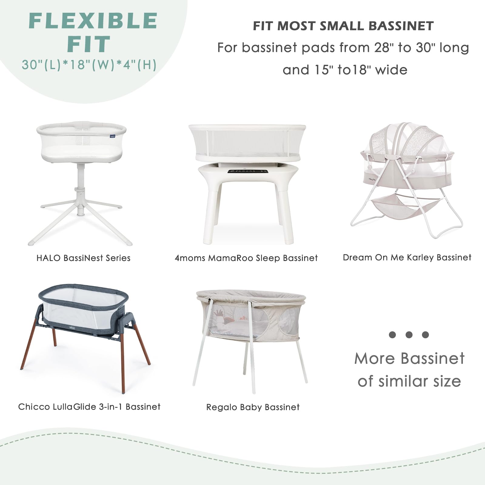 FLEXIBLE FIT - These bassinet sheets measure 30x18 inches and made specifically for most small-sized bassinet such as Halo BassiNest Series, 4moms MamaRoo, Chicco LullaGlide Bassinet. With an elastic band around the bottom edge of each sheet to ensure a snug fit, these bassinet mattress sheets are flexible fit pads from 15" to 18" wide and 28" to 30" long